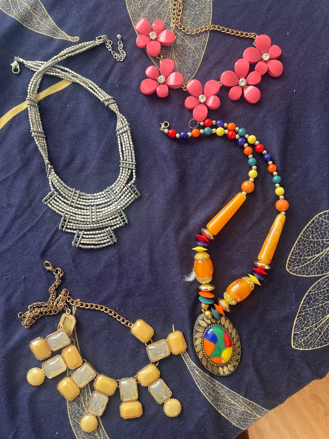 Four unique fashion necklaces to accessorize any outfit. Includes a silver beaded statement necklace, a pink floral collar necklace, a colourful beaded necklace with amber-like accents, and a yellow and grey rectangular stone necklace. These pieces add a pop of style and personality.