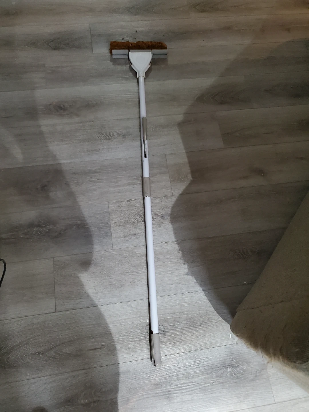 This cleaning mop features an extendable handle for easy reach. It comes with a sponge head for effective cleaning. The handle adjusts to your needs. It's great for keeping floors tidy!