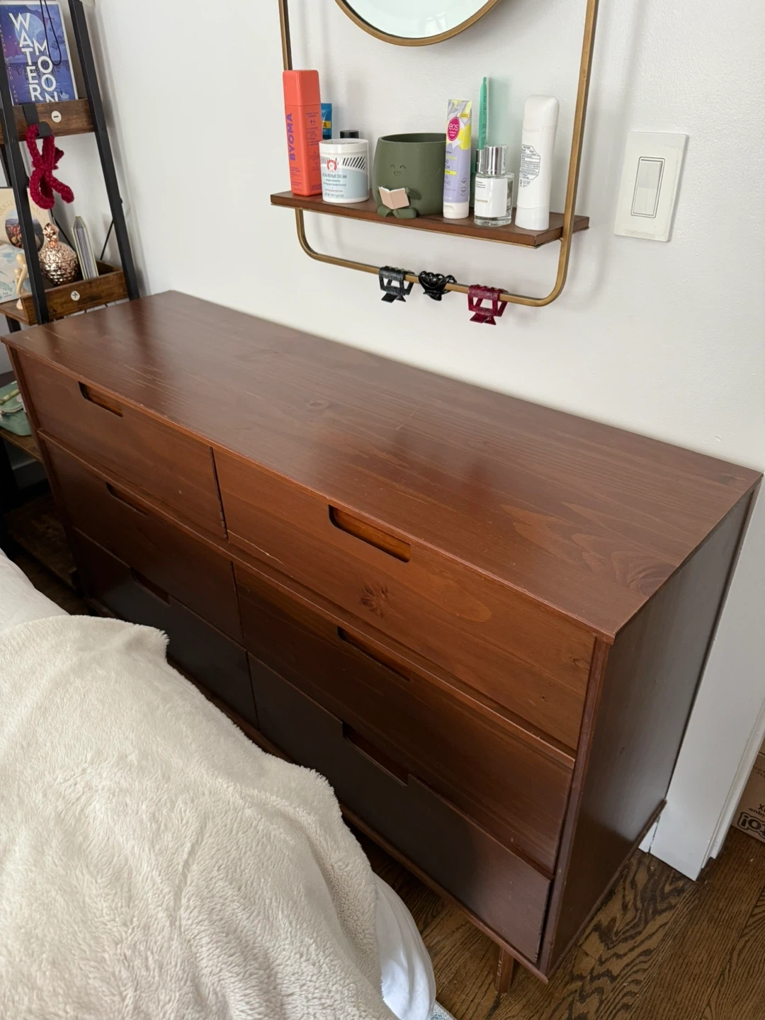 In good shape, has a few nicks/cracks (pics attached). Love this dresser, but it's not a pertect fit in my new space. 2nd picture is wher I got it, 3rd picture is today. Bought for ~$400 in 2021.