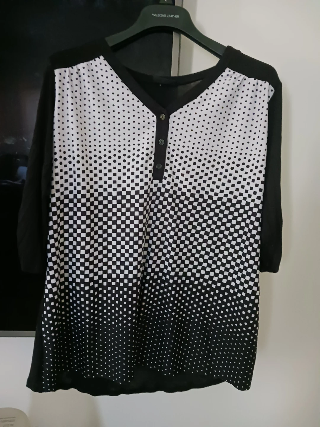 A stylish tunic top with a V-neck and button detail. It's designed with a black and white gradient checkered and dotted pattern. The sleeves are 3/4 length.