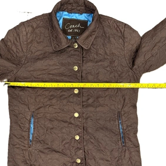 Original price $400. Elevate your layering game with this classic Coach Signature Quilted Jacket. This iconic piece blends equestrian style with urban utility, featuring the timeless all-over Signature C logo pattern in a rich dark brown. The vibrant turquoise blue lining adds a stunning pop of color when worn open or with the sleeves cuffed.