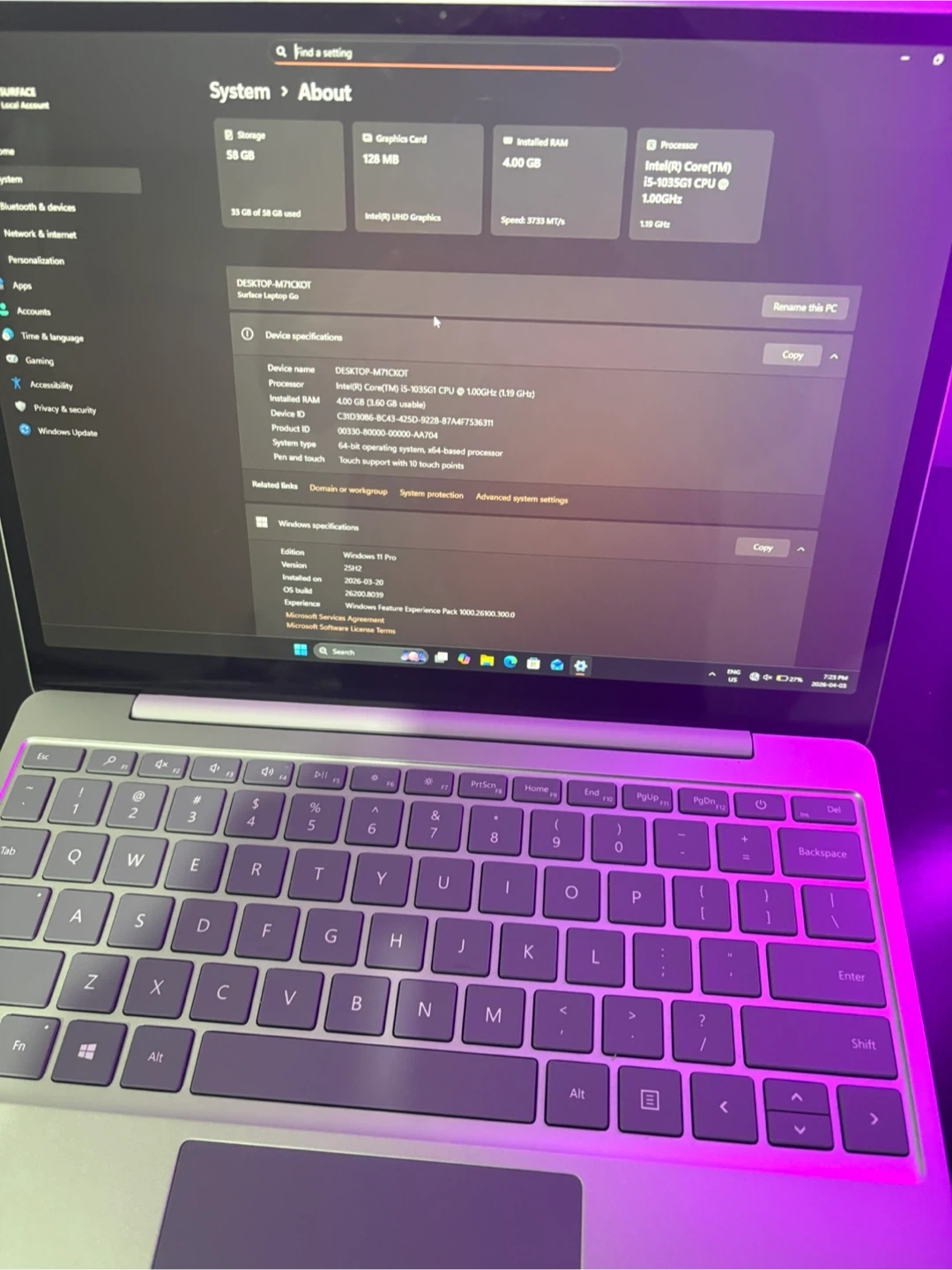 Microsoft Surface Laptop Go laptop. It's powered by an Intel Core i5-1035G1 processor and has 4GB of RAM. Storage is 128GB SSD. This model supports touch input with 10 touch points. Windows 11 Pro is installed.