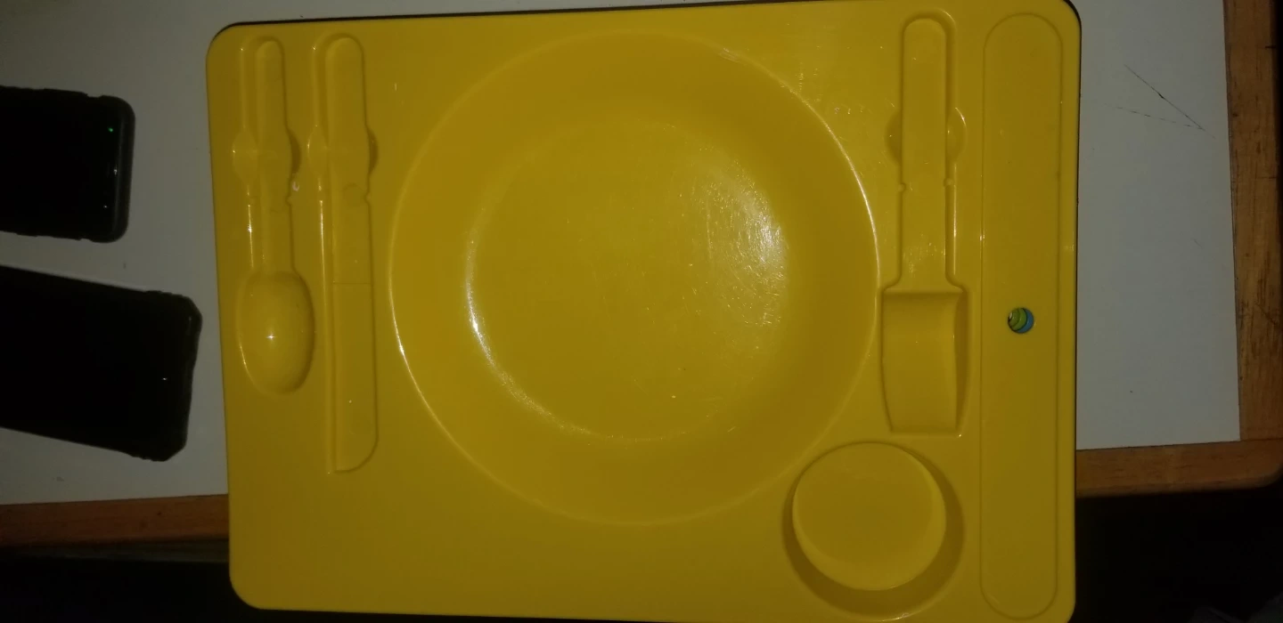 This yellow mealtime set includes a plate, cup holder, and built-in utensil slots. It's designed to help little ones learn to eat independently. Great for transitioning to solids!