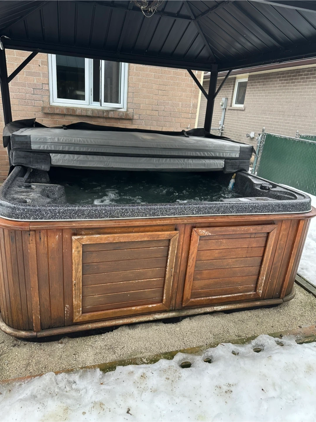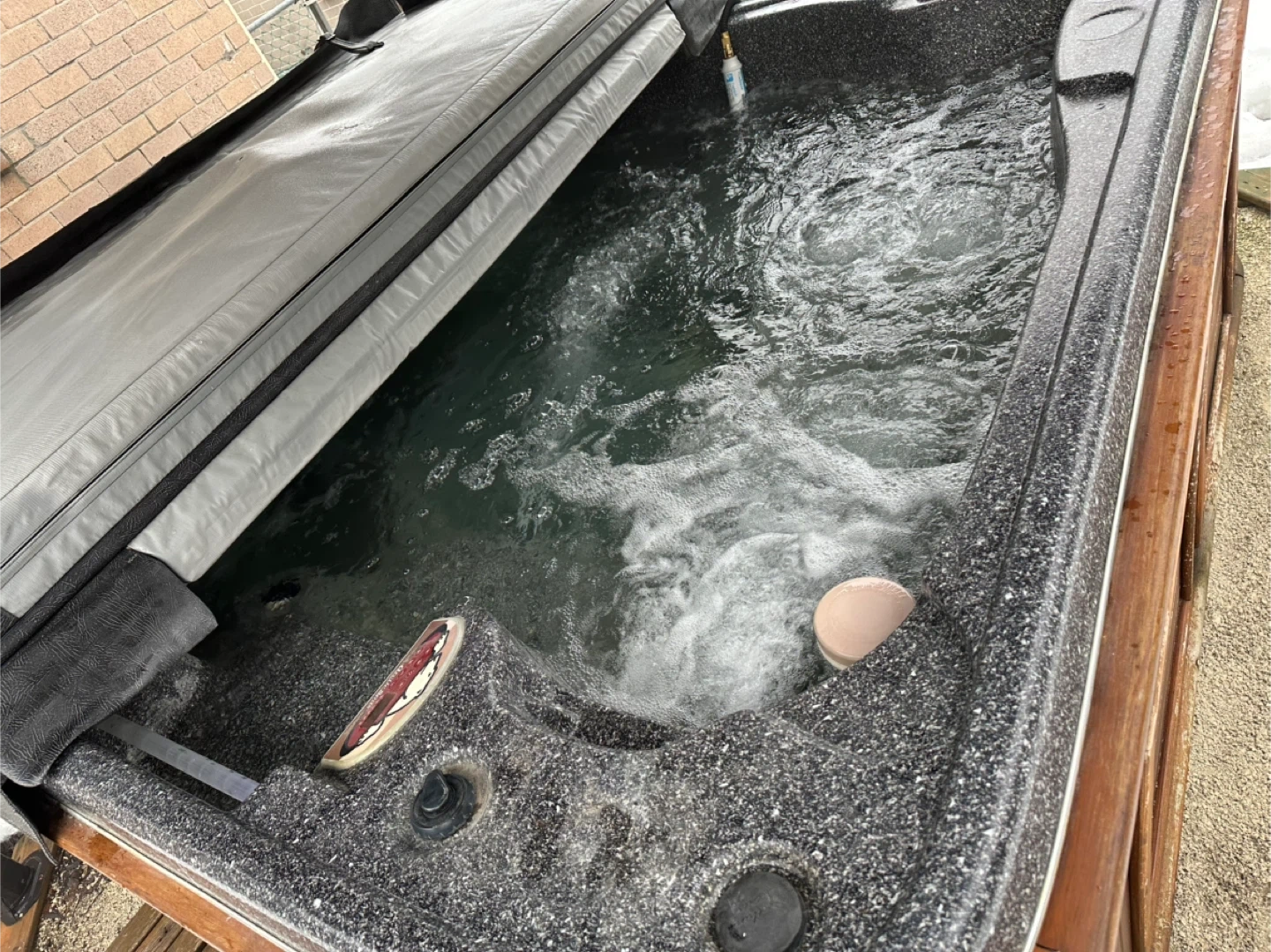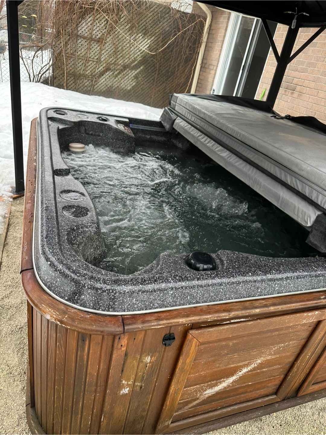 Arctic Spas hot tub with a wooden cabinet. It features a built-in control panel for jets and temperature. This hot tub is great for relaxing outdoors and enjoying a warm soak, even in cooler weather.