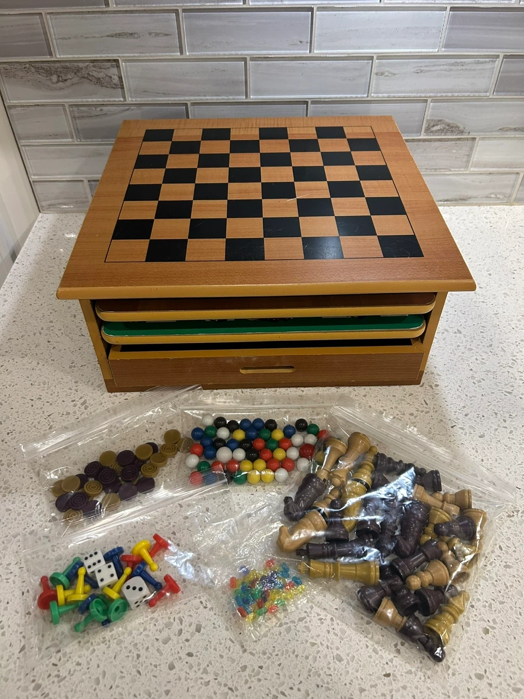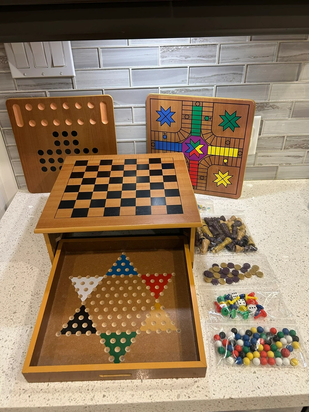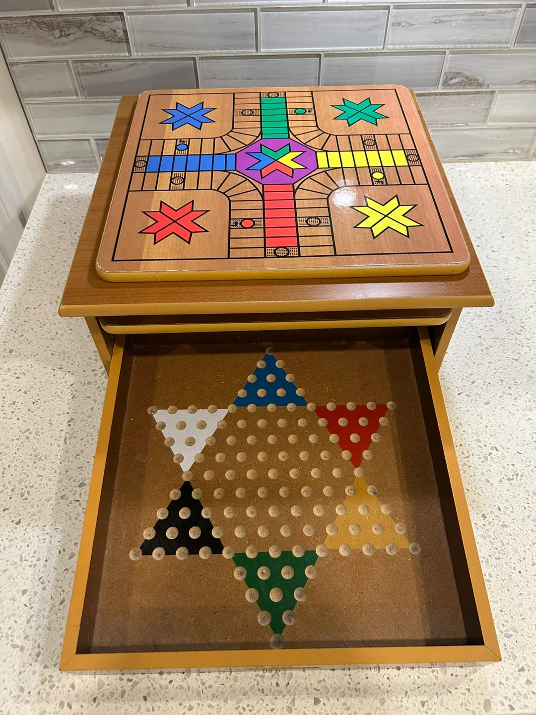 This wooden game box includes multiple playable boards. Chess, Chinese Checkers, peg solitaire board, Parcheesi / Ludo board, ladder board game. Great for family game nights!