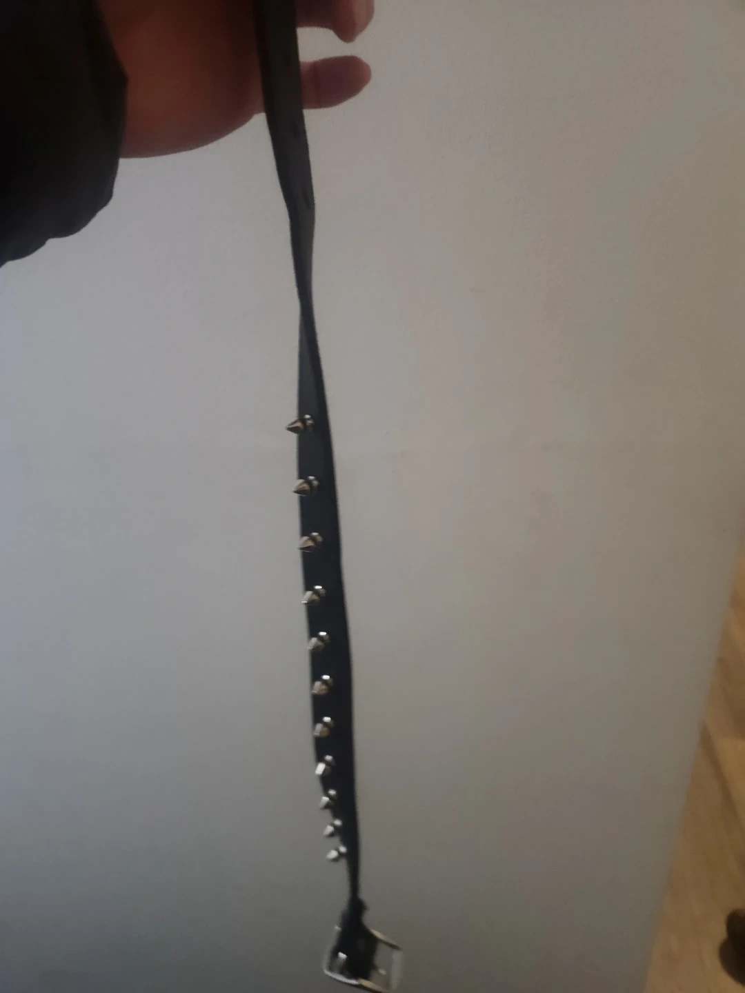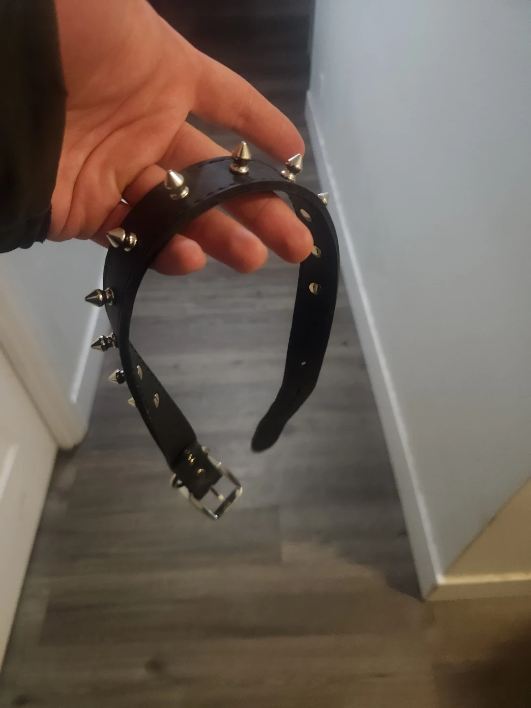 Black leather spiked collar for dogs. It has a metal buckle closure for adjustable fit. Spikes are silver-toned metal.