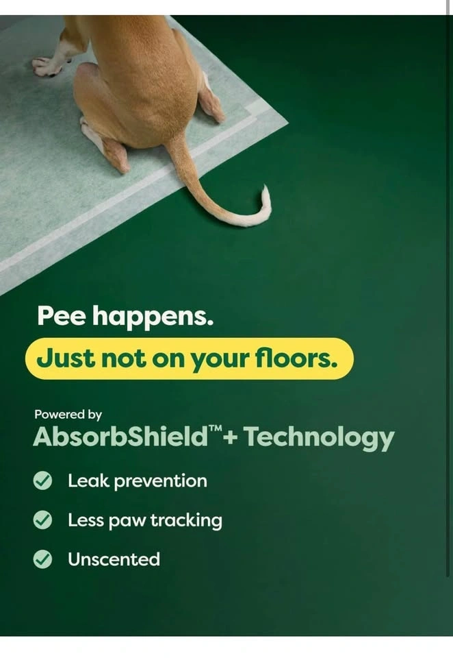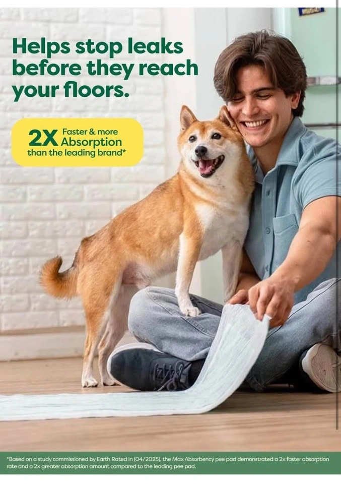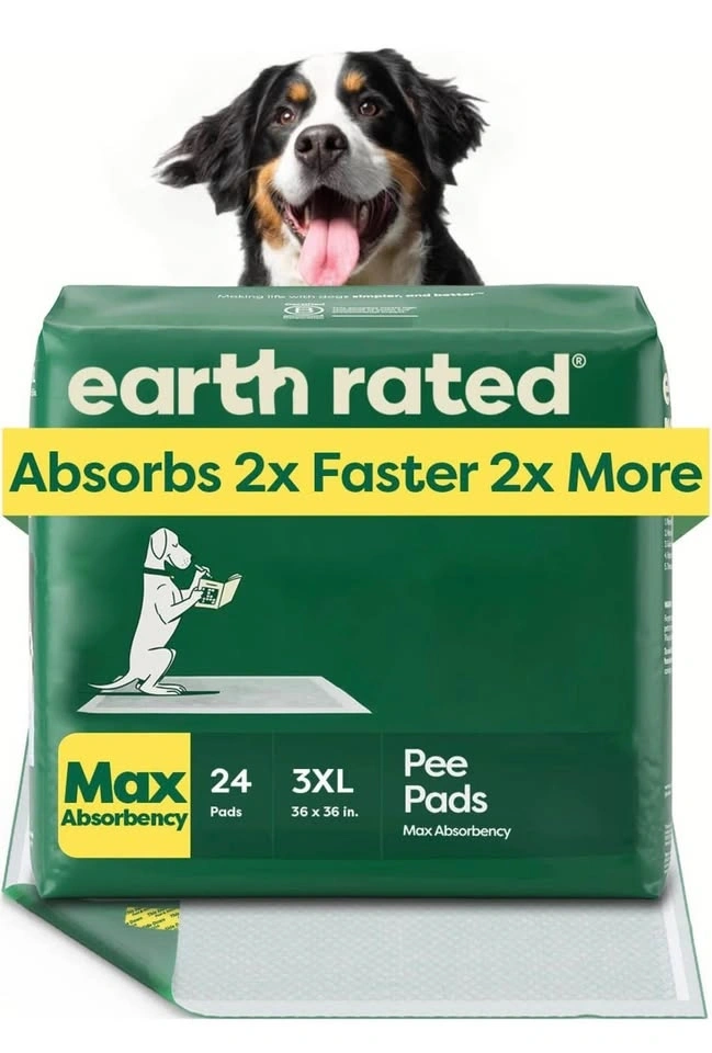 Brand new Earth Rated pee pads! These are the 3XL size, 36x36 inches, with 24 pads included. They are super absorbent for big dogs over 60 lbs, featuring Max Absorbency that soaks up 2x faster. AbsorbShield Technology helps prevent leaks and reduces paw tracking. Unscented with adhesive tabs on the bottom to prevent sliding.