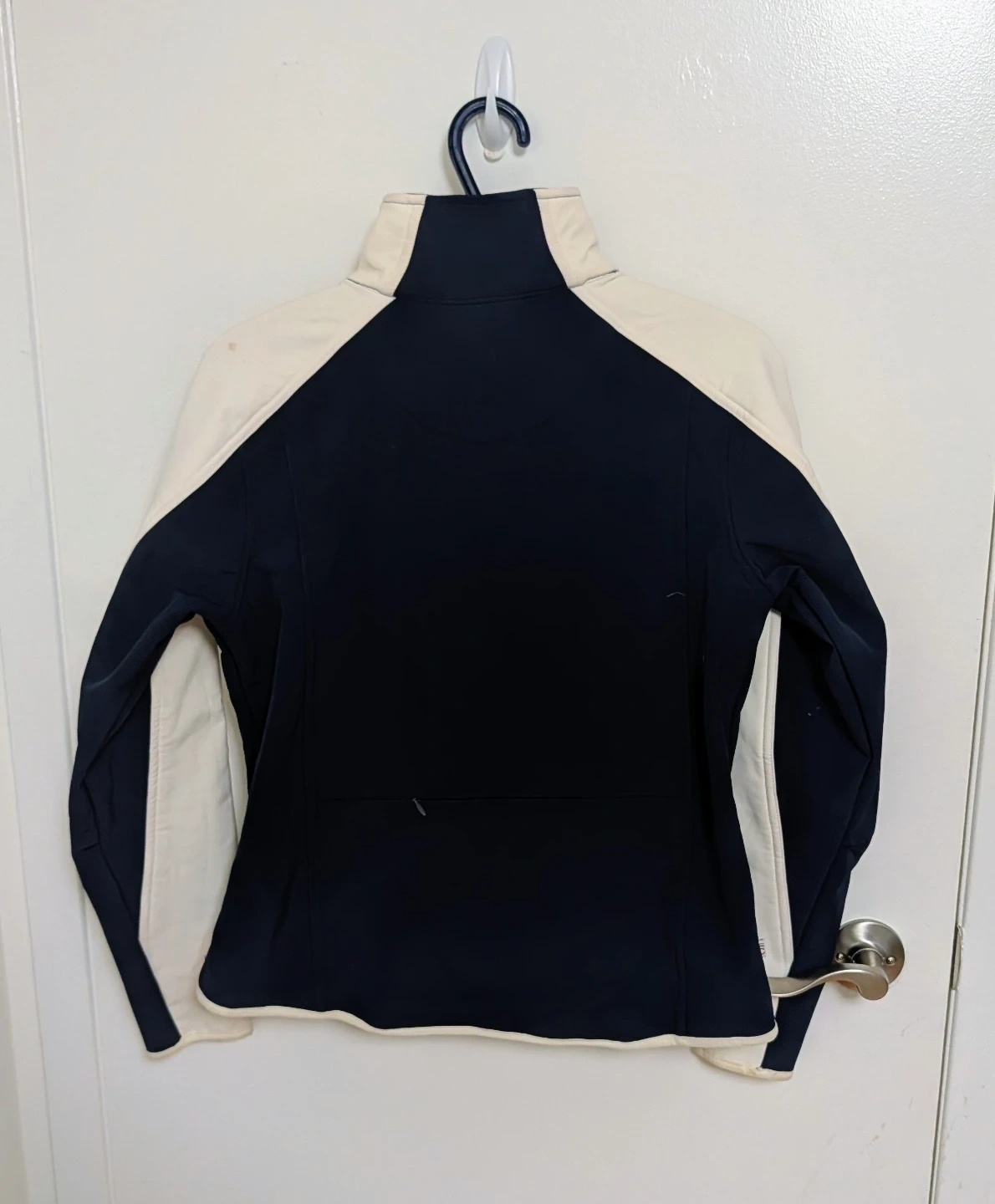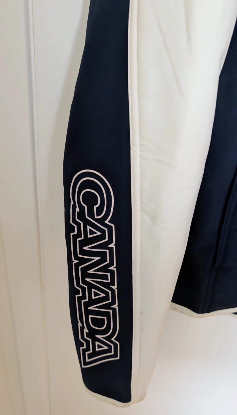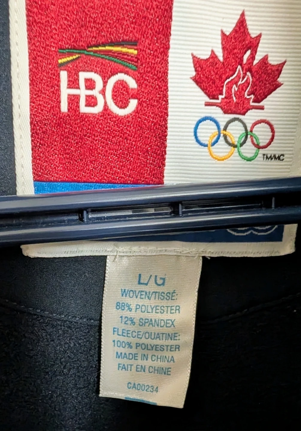 This HBC jacket features the Canadian Olympic logo and "CANADA" on the sleeve. It's made of 88% polyester, 12% spandex, with a fleece lining. Made in China.