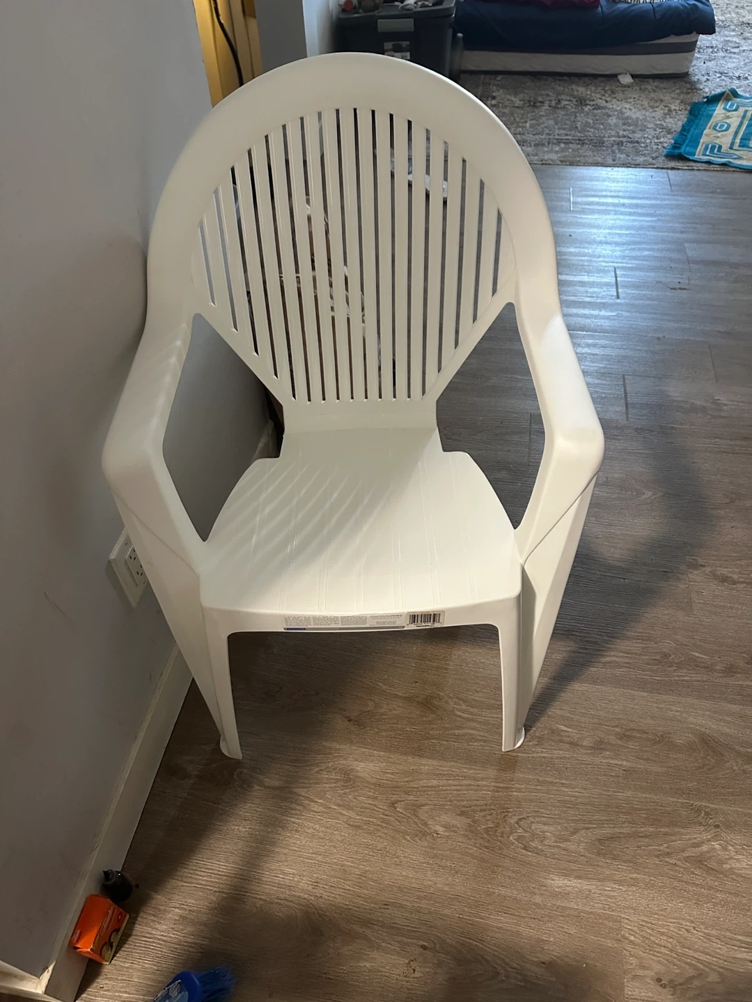 This is a white plastic outdoor chair. It's made of durable plastic material. This chair is great for patios or decks!