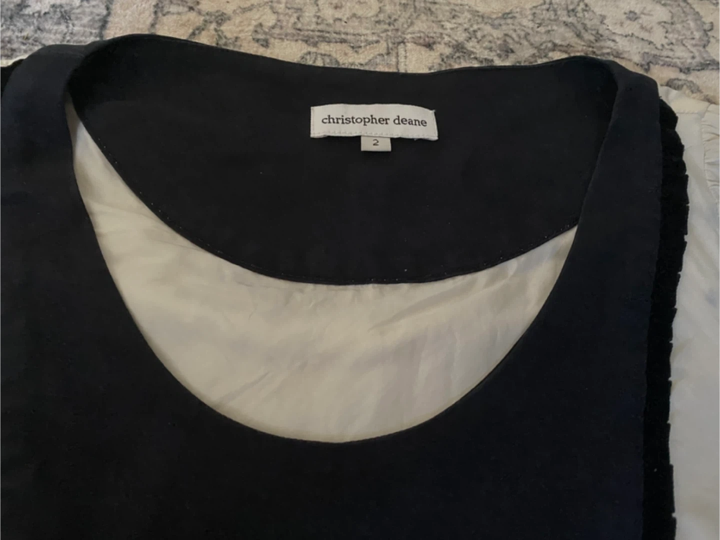 Cream silk dress with a black yoke and trim. Short puff sleeves and a black hemline panel. Size is 2.
