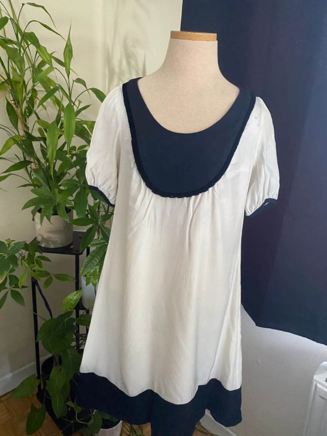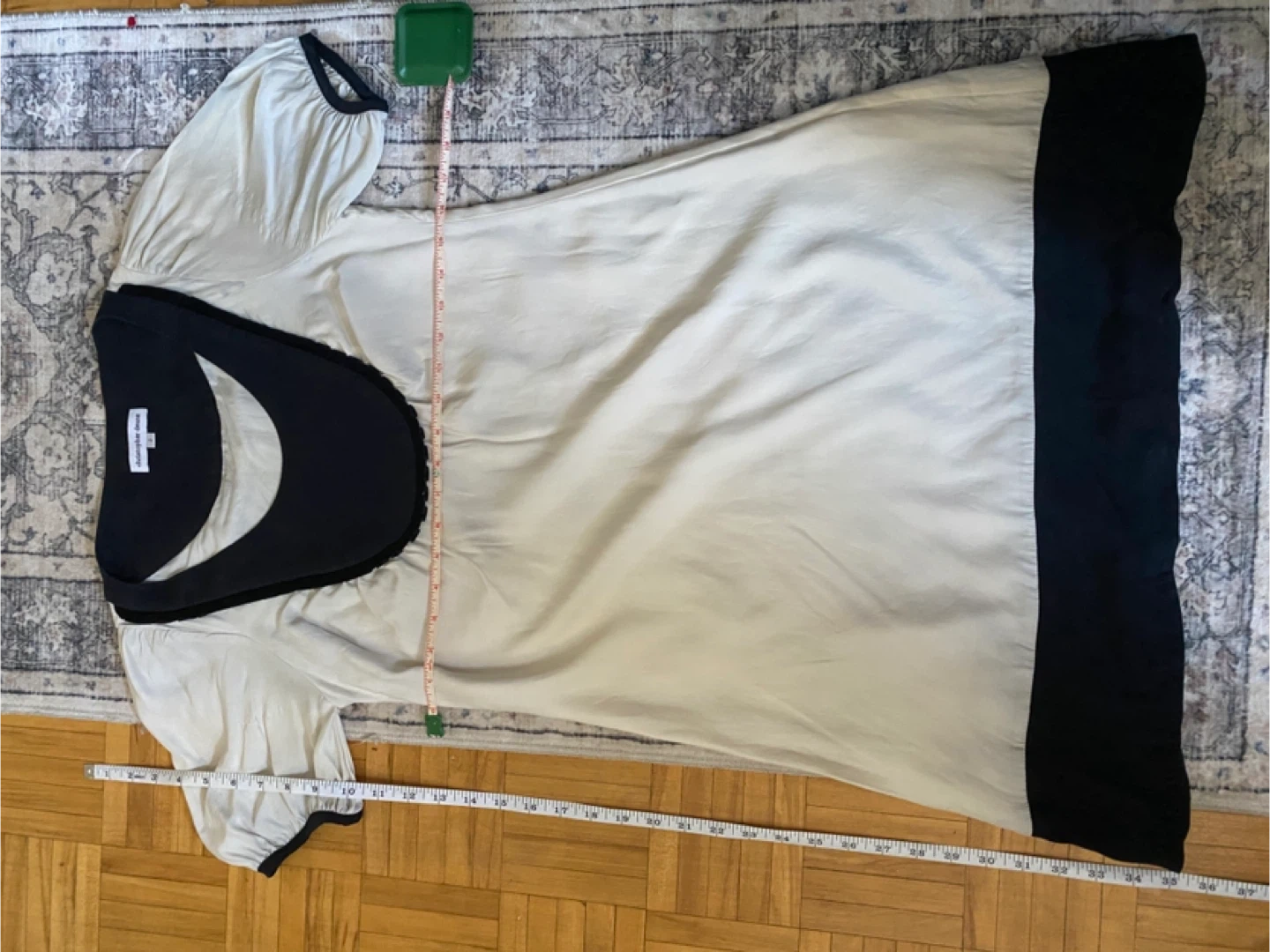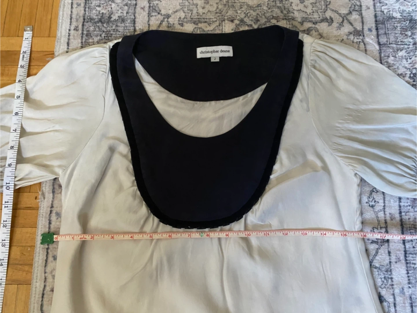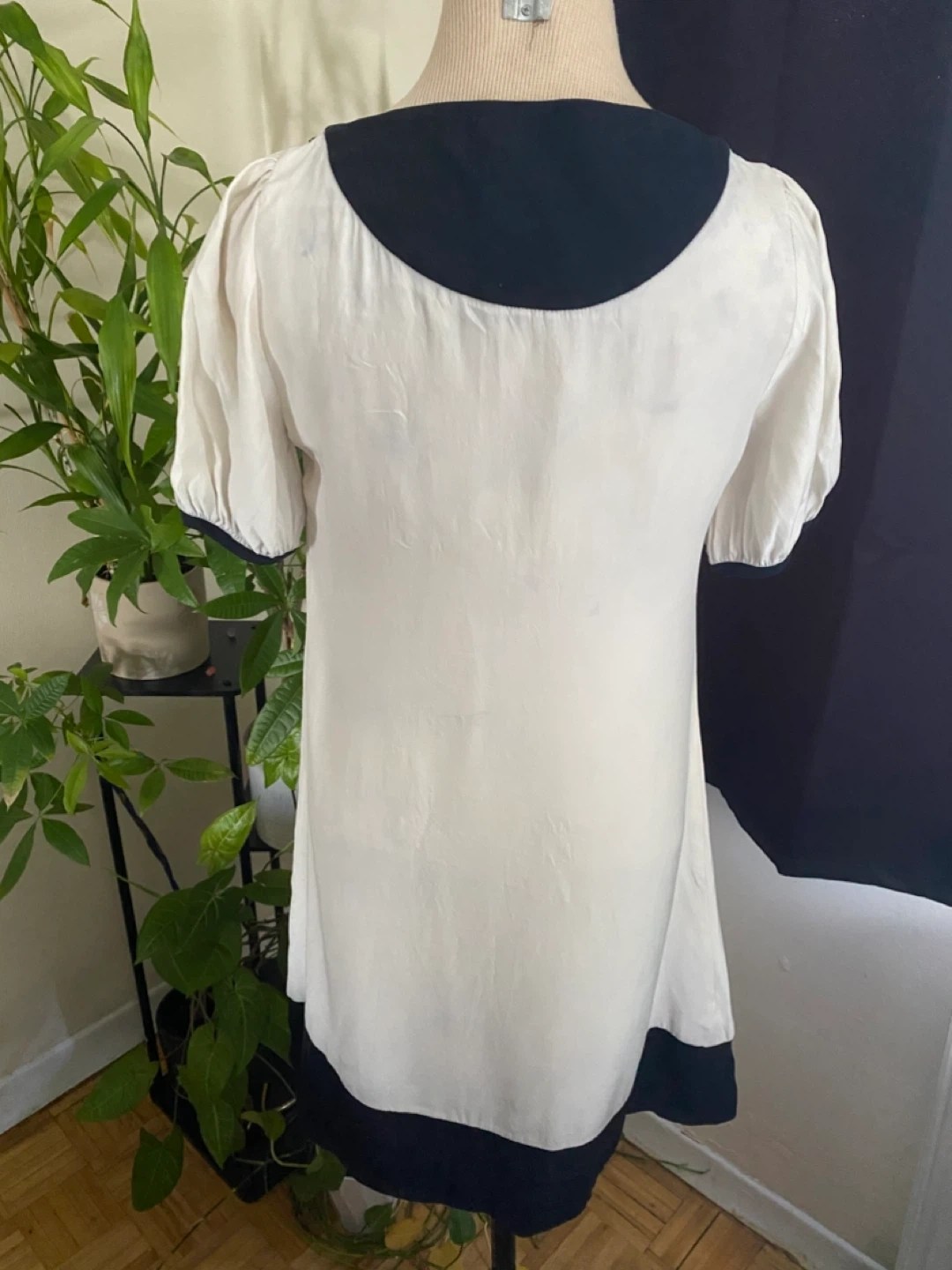 Cream silk dress with a black yoke and trim. Short puff sleeves and a black hemline panel. Size is 2.