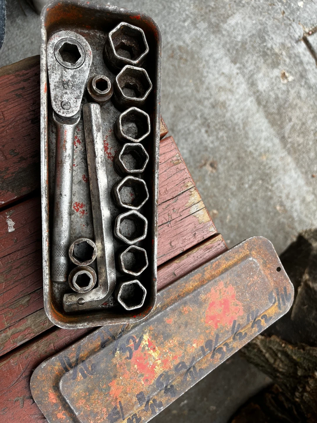 This is a vintage socket wrench set in its original metal case. It includes a ratchet handle, extension bar, and various socket sizes. The metal case shows some rust and wear, consistent with its age. This set is great for tackling various mechanical tasks!
