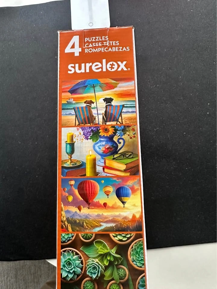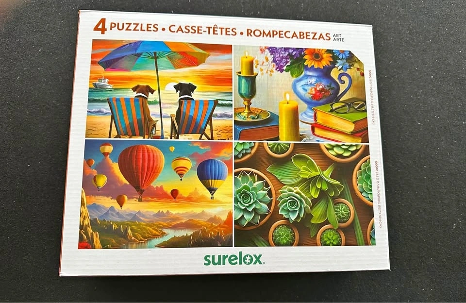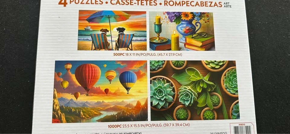 Box with 4 puzzles: 2 x 500 pc (18x11”) and 2 x 1000 pc (23.5 x 15.5”). Made once by me. The two 1000-piece puzzles can be challenging. Pickup in Sidney.