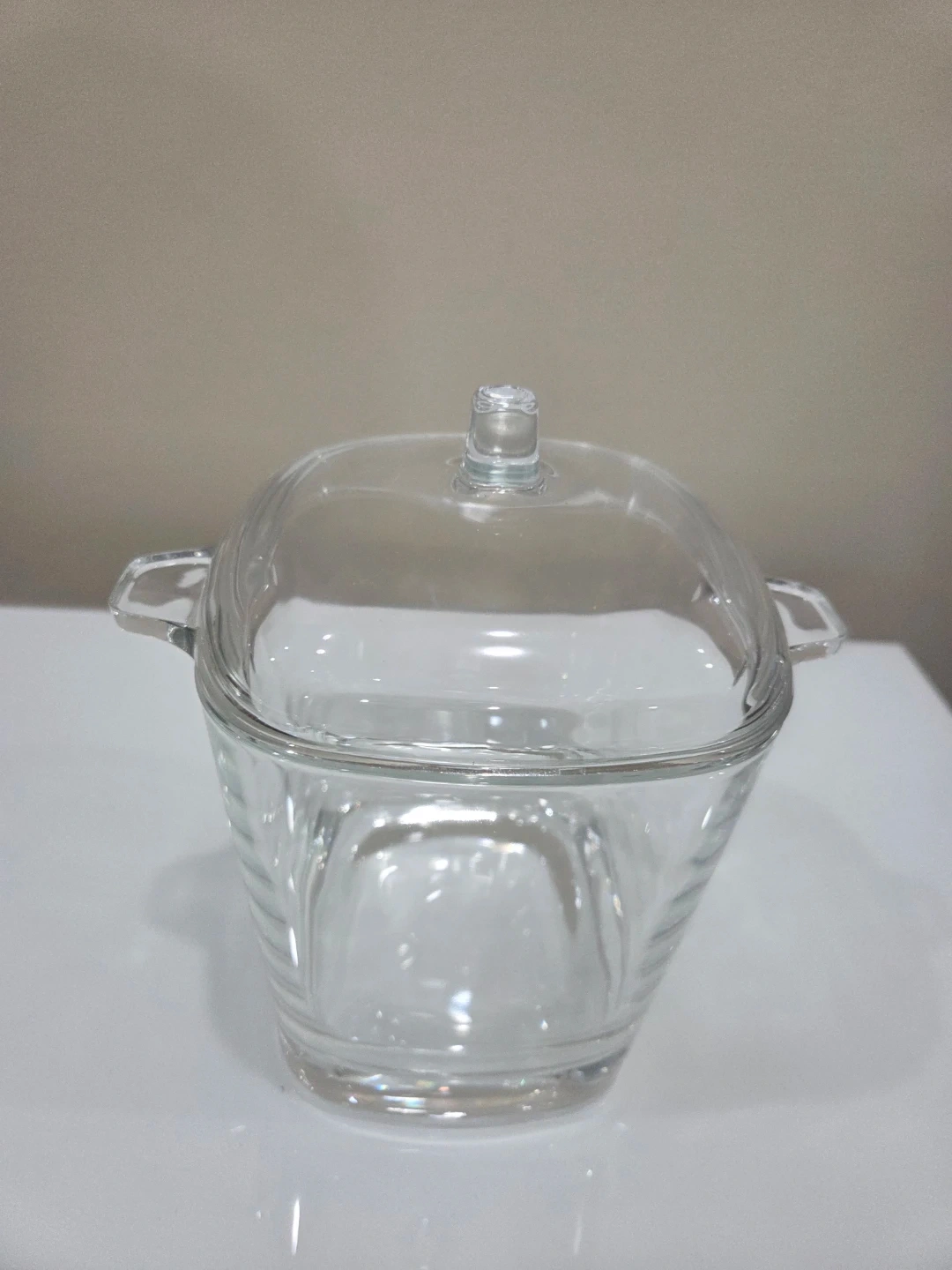 A clear glass dish complete with a matching lid. It's made of durable glass, suitable for serving ice or storing food. The handles make it easy to carry.