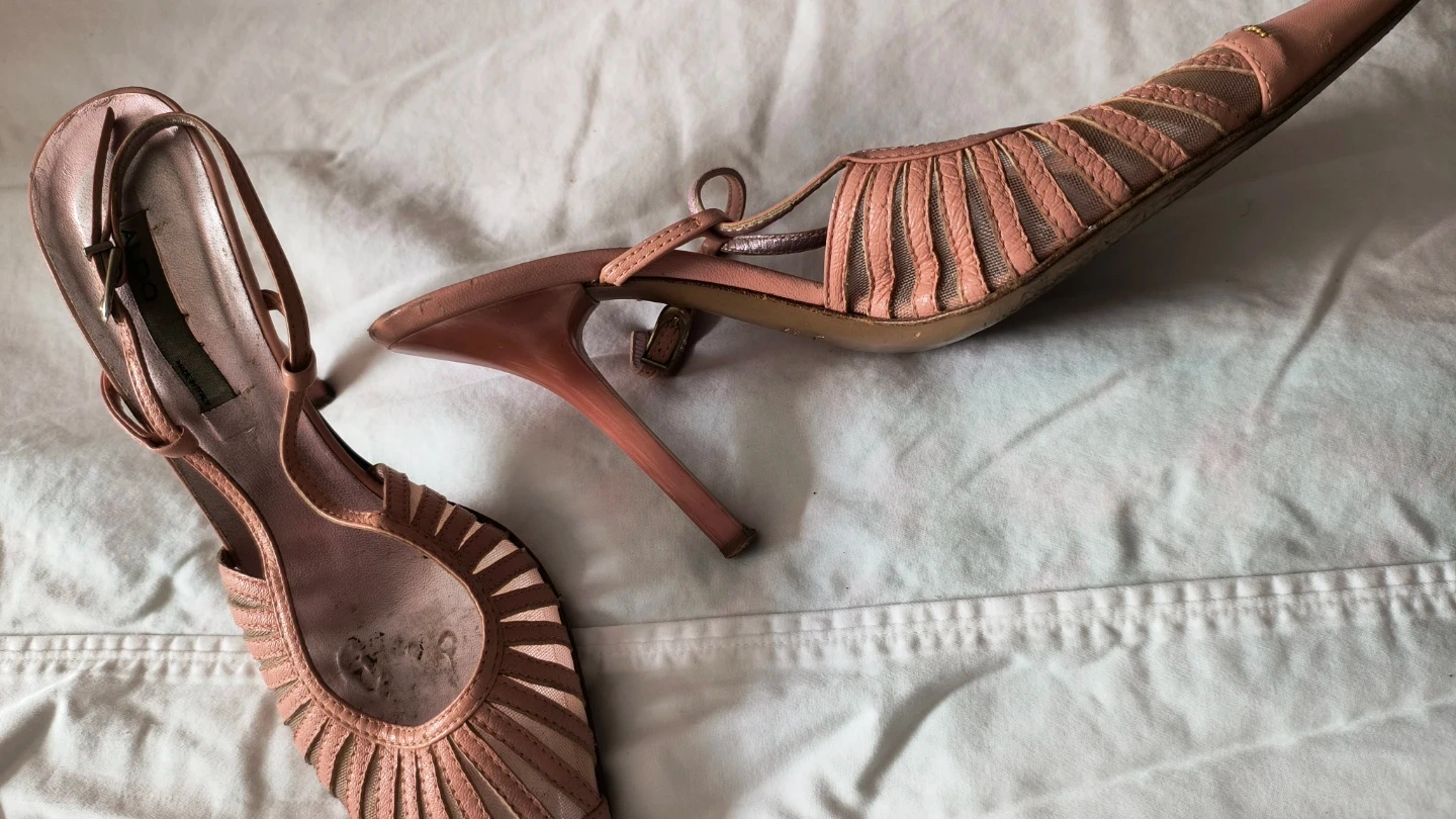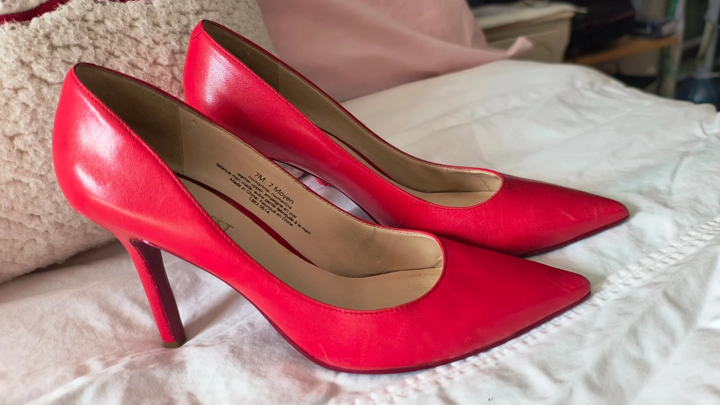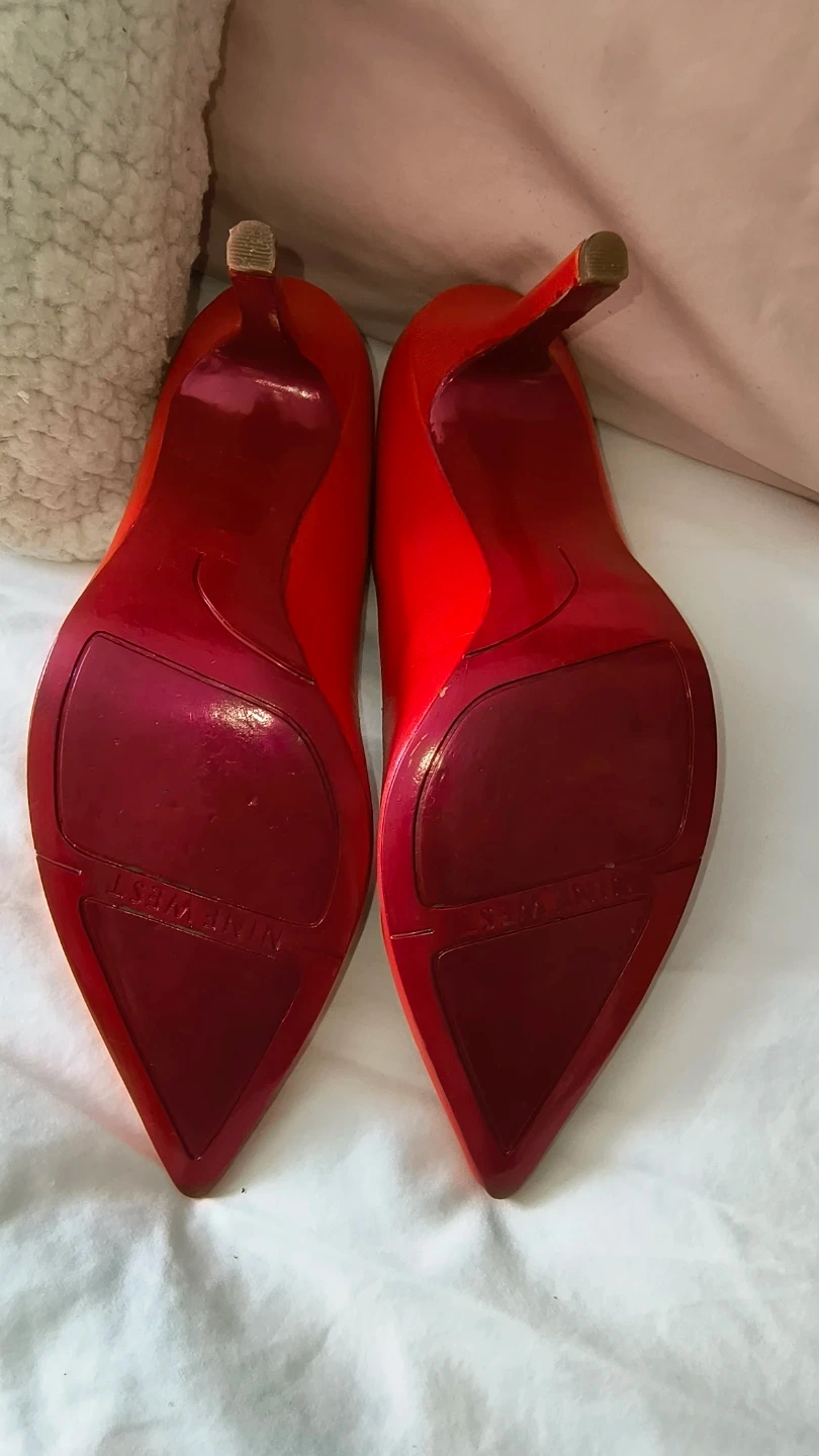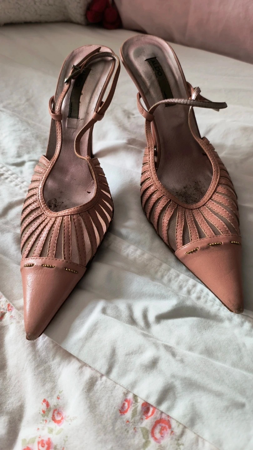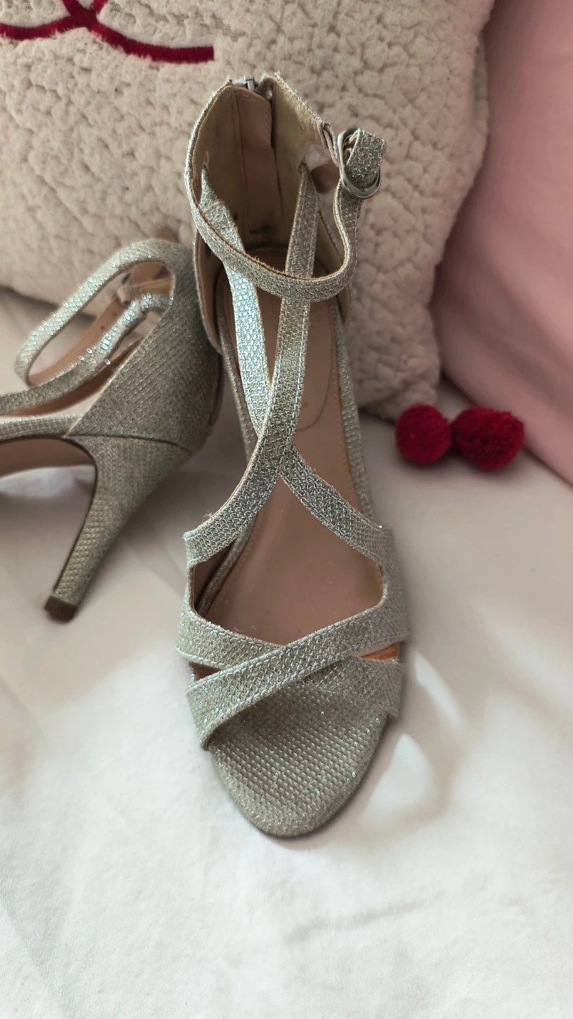 Leather walking shoes sz 6.5. in great condition , pink sling backs in fair condition 5.00 and silver 6.5 sz sparkly heels never worn. Front cross over like a dance shoe. Red heels that have been painted red. All 5.00