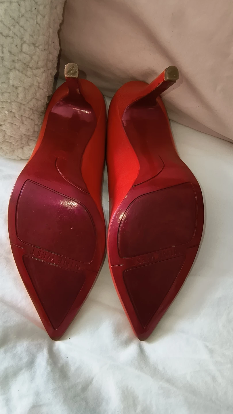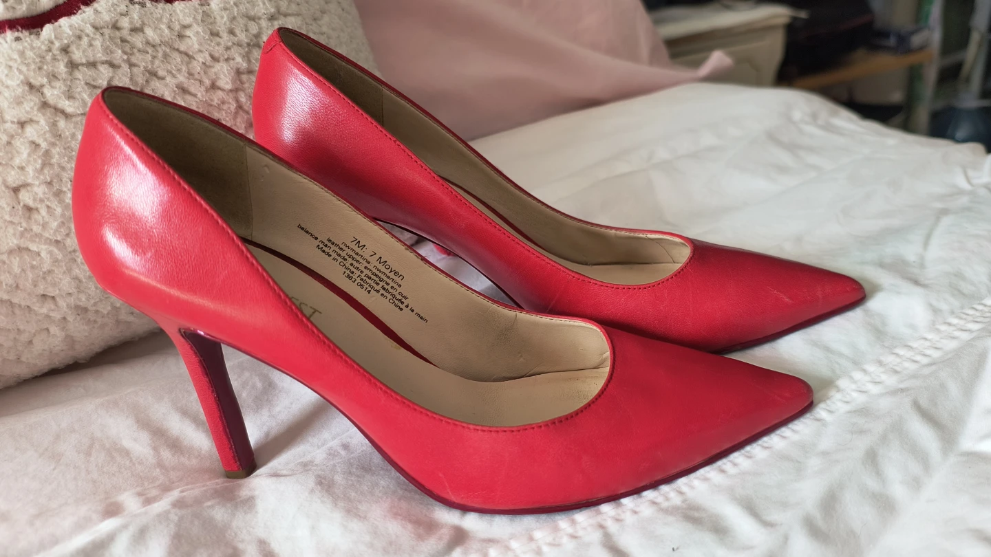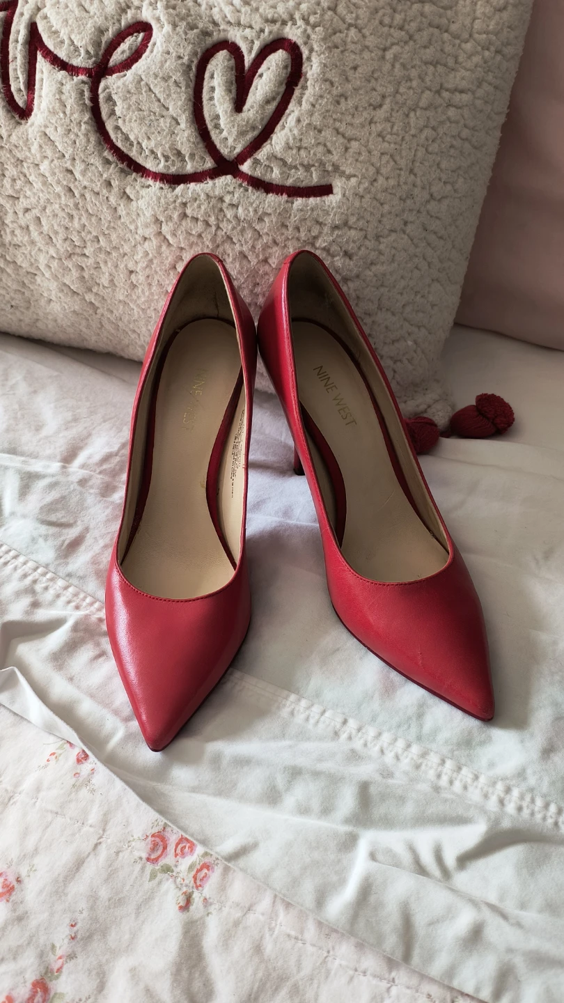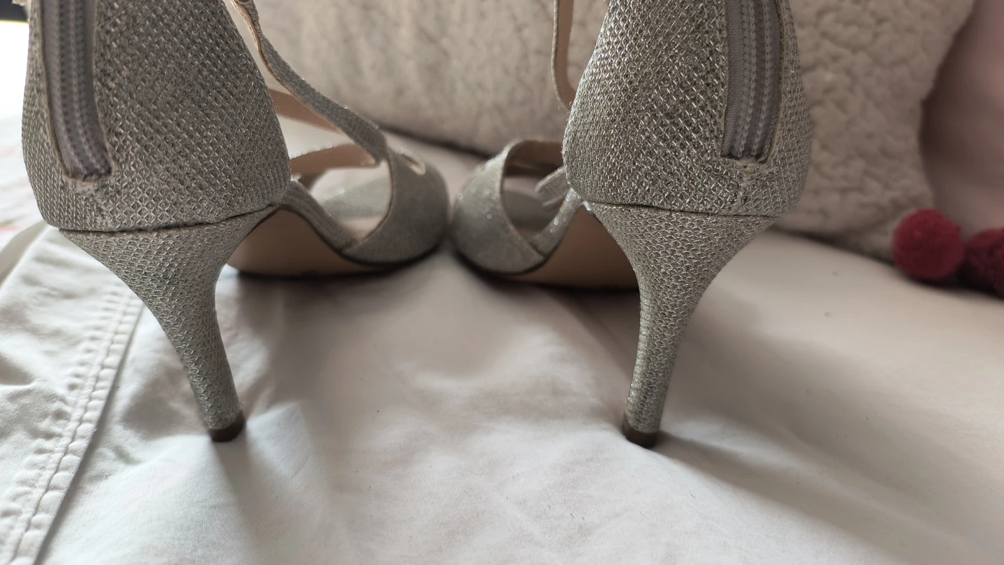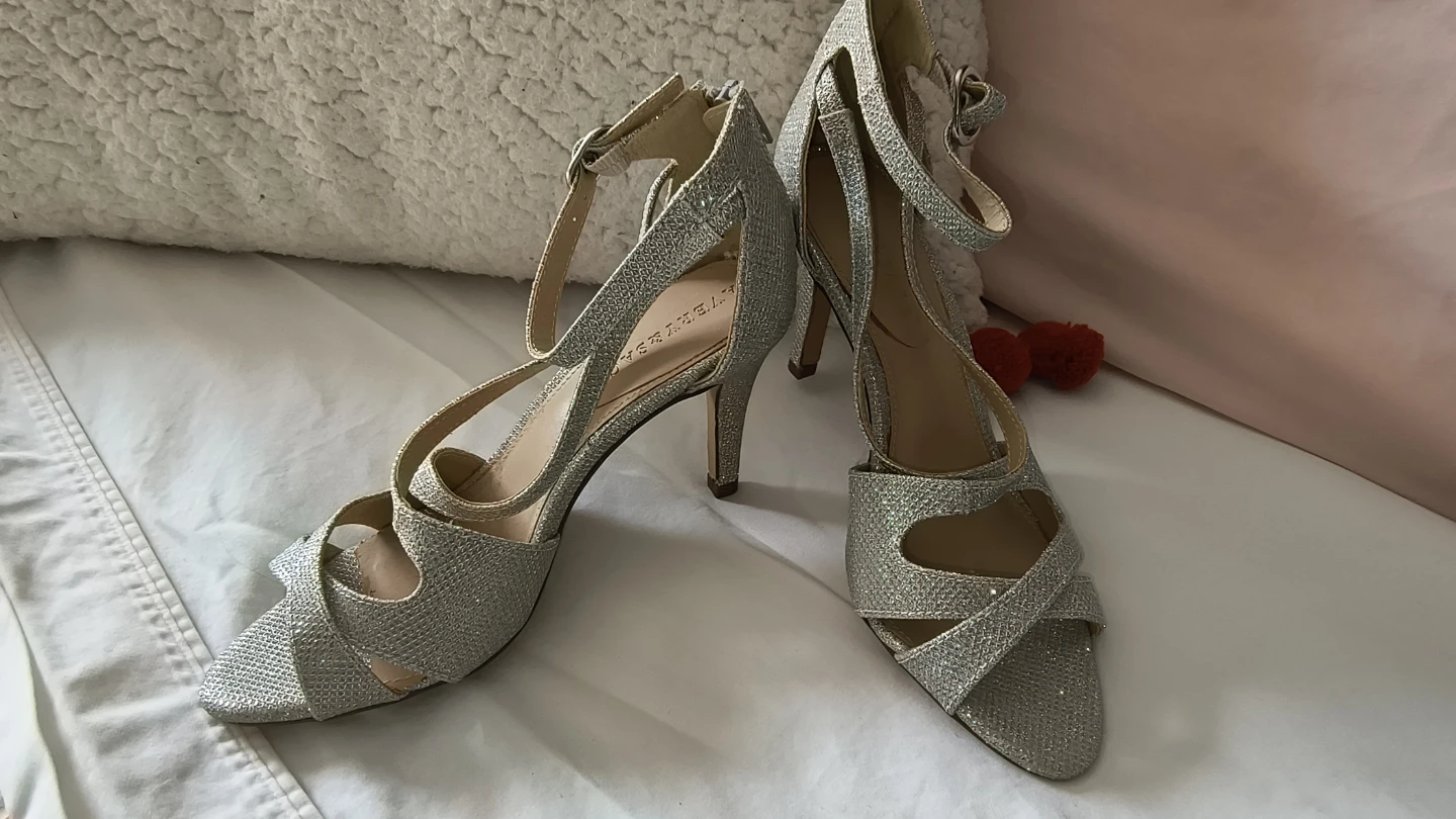 Leather walking shoes sz 6.5. in great condition , pink sling backs in fair condition 5.00 and silver 6.5 sz sparkly heels never worn. Front cross over like a dance shoe. Red heels that have been painted red. All 5.00