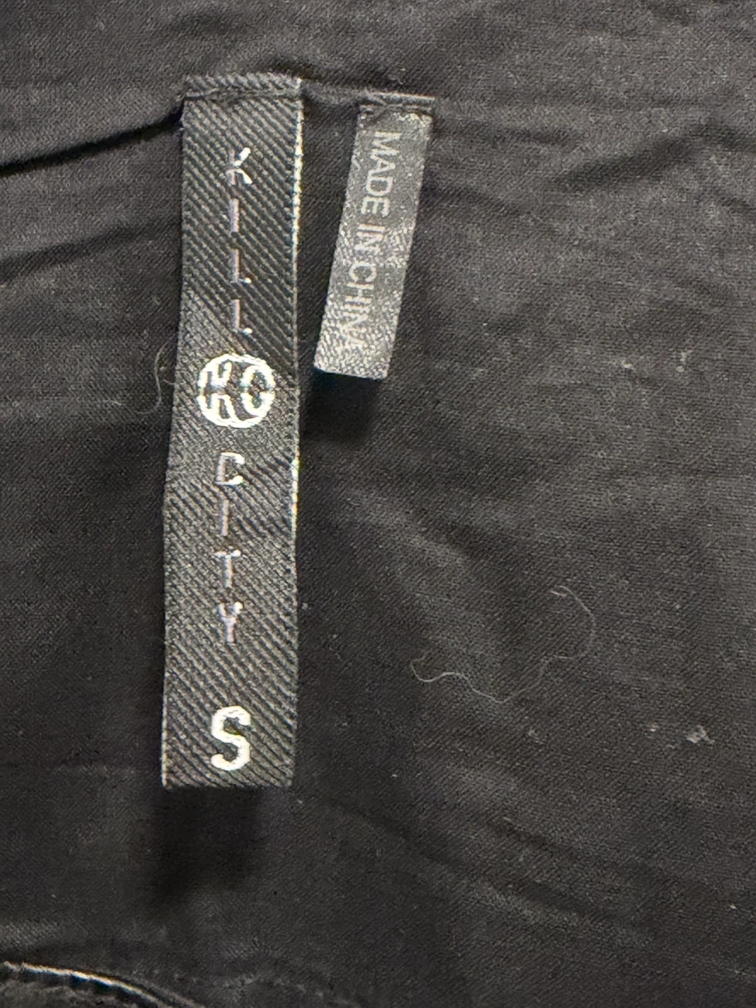 Black Kill City tank top with studded faux leather front. Ribbed back panel and cross-strap detail. Made with a cotton blend. Size small.
