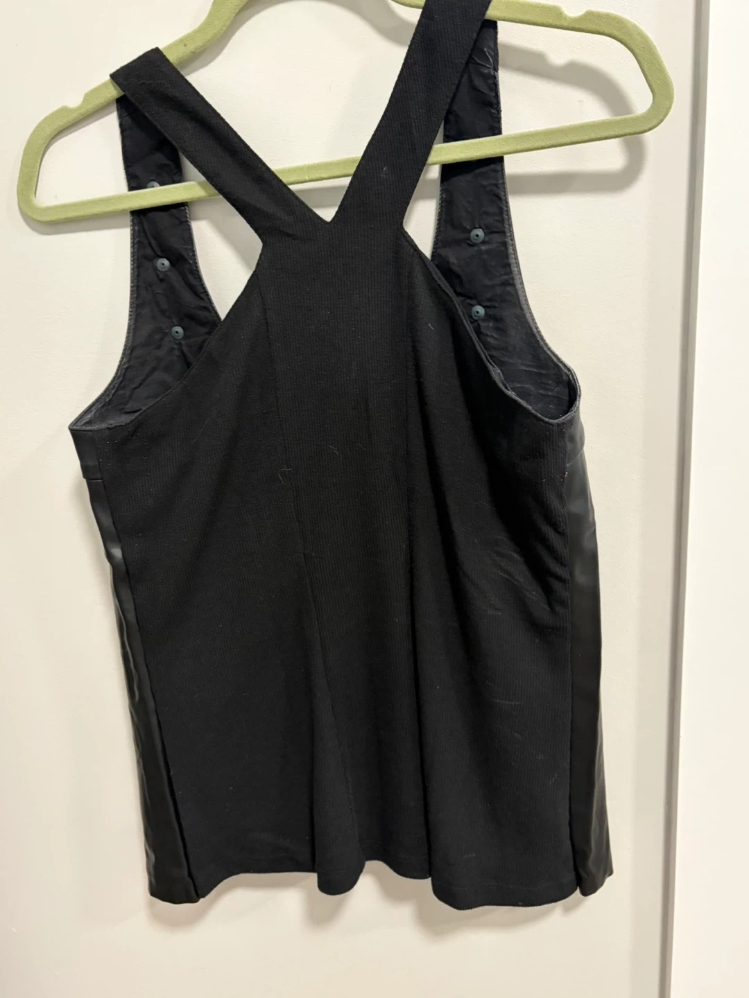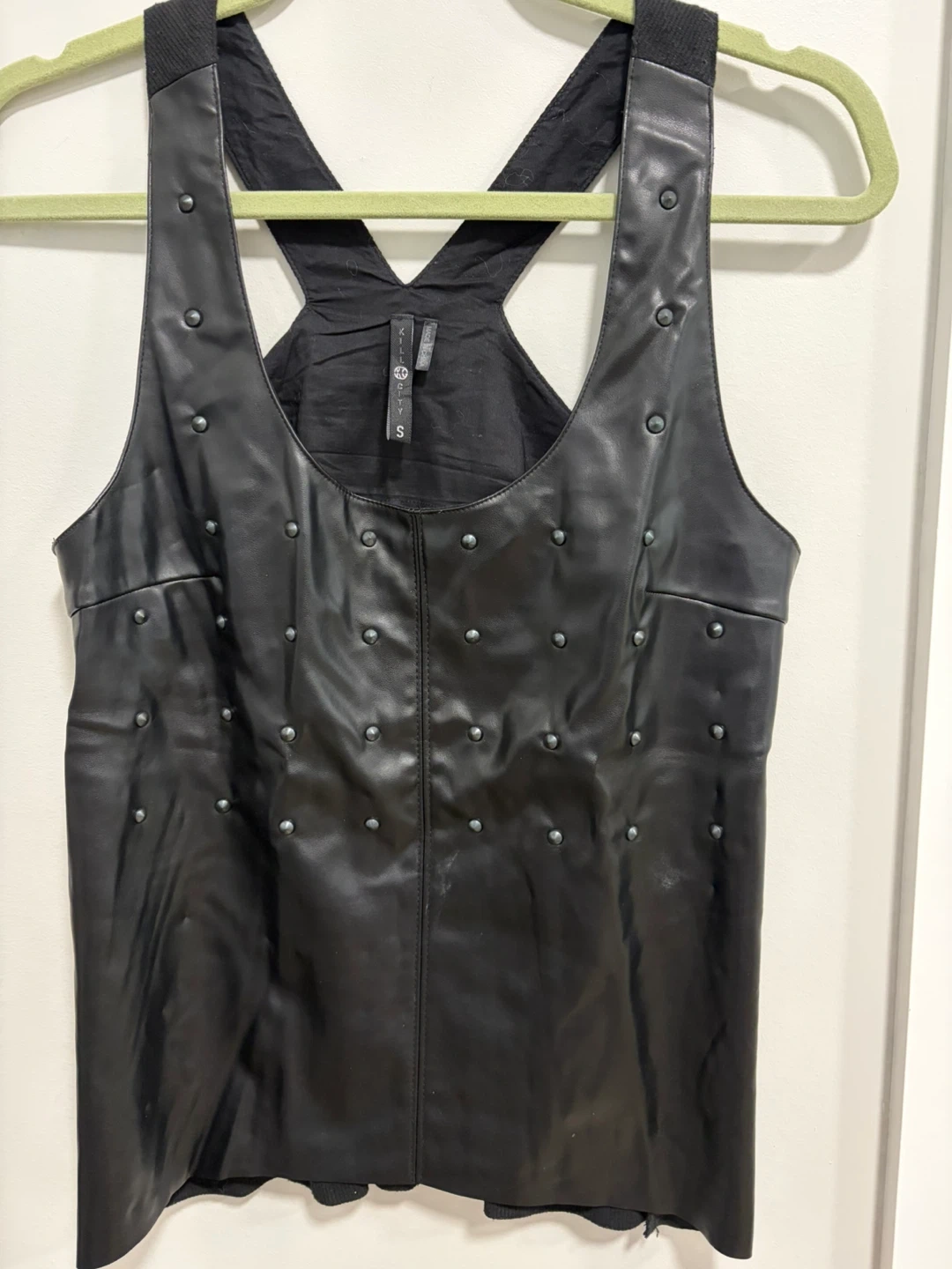 Black Kill City tank top with studded faux leather front. Ribbed back panel and cross-strap detail. Made with a cotton blend. Size small.