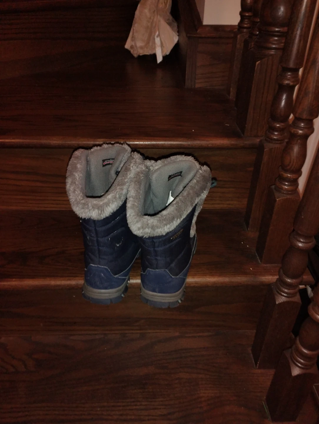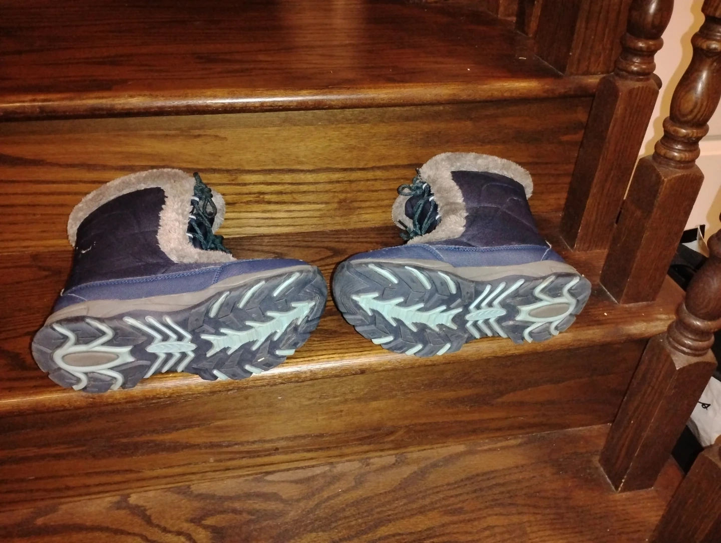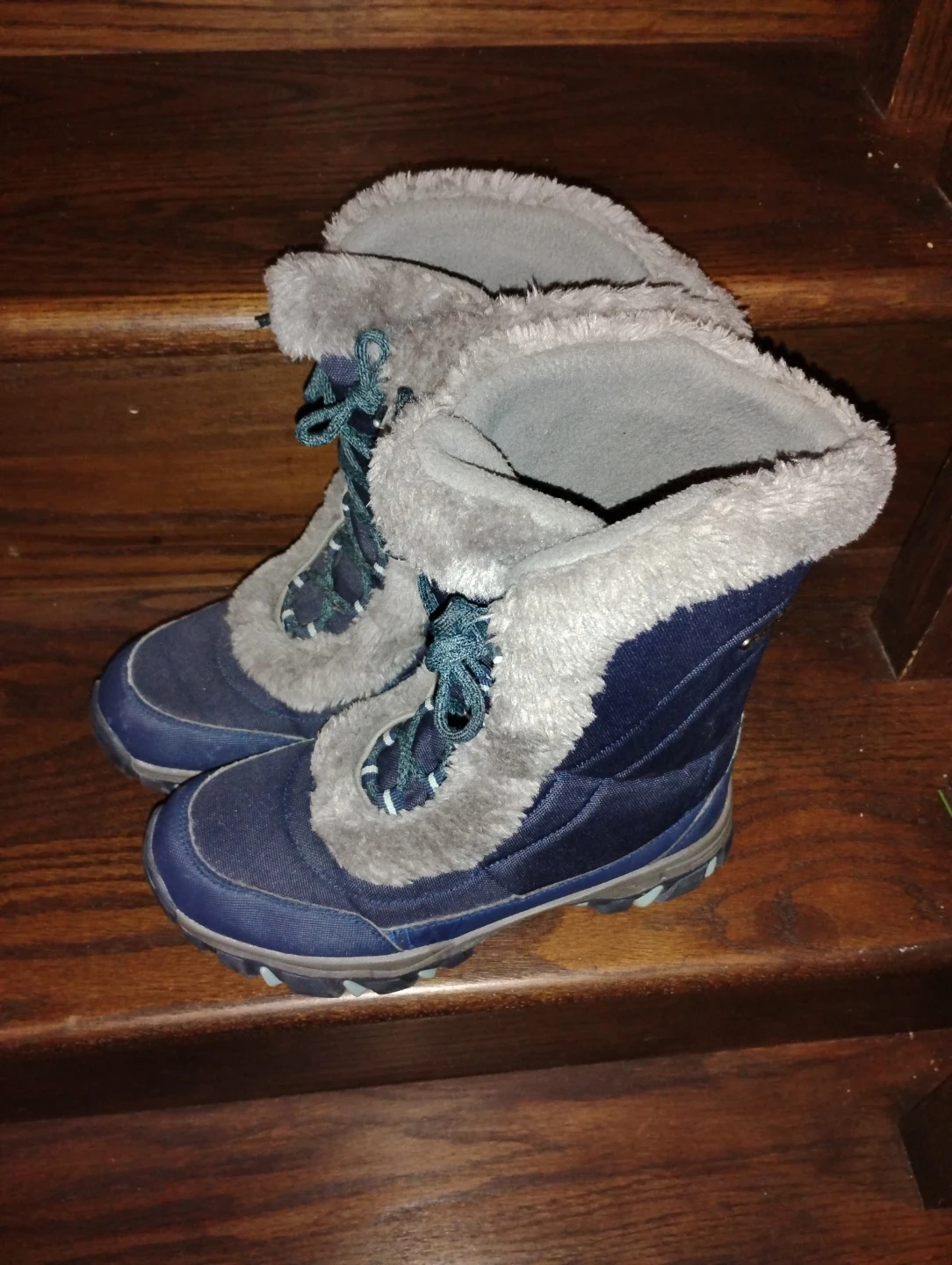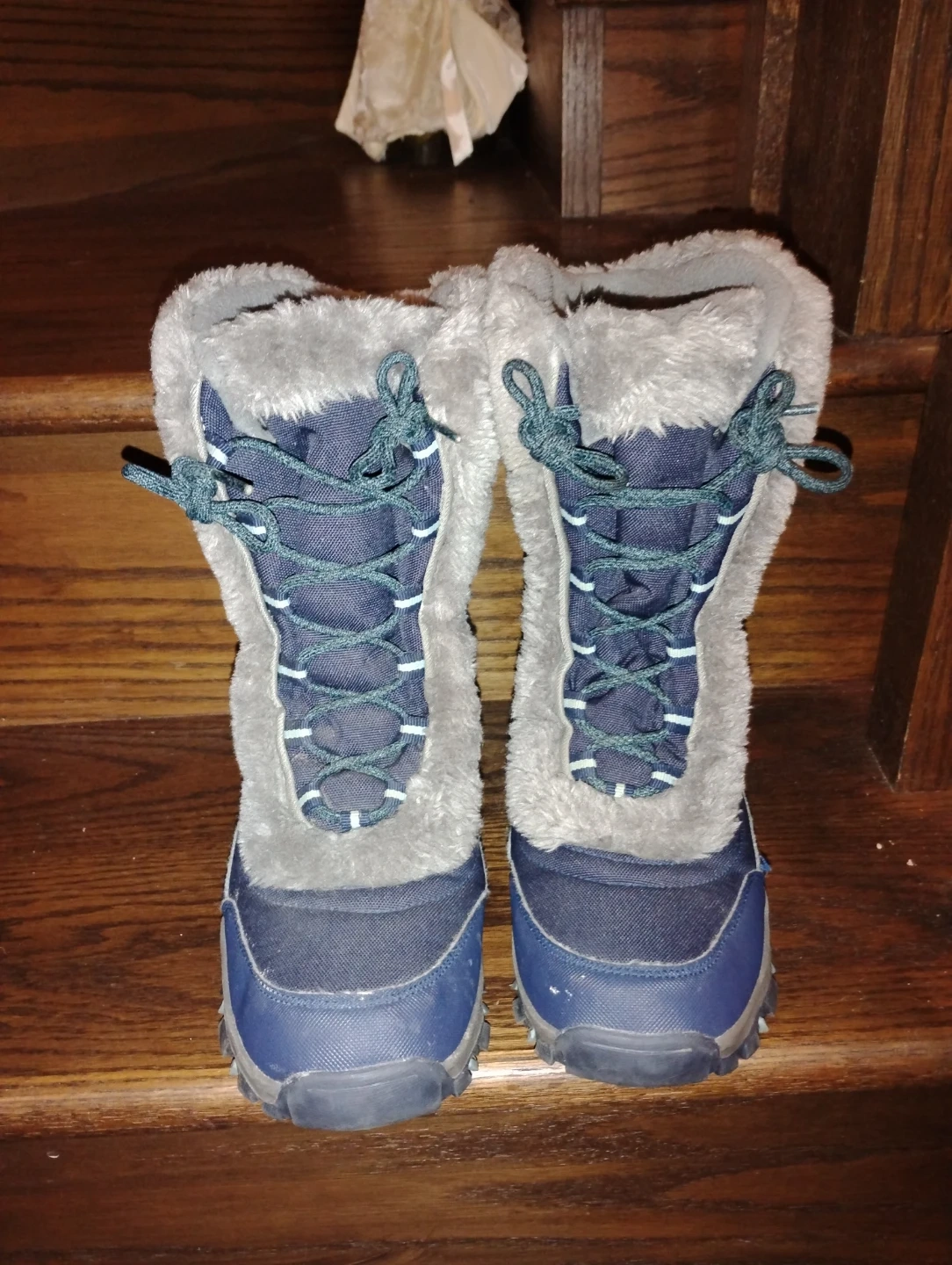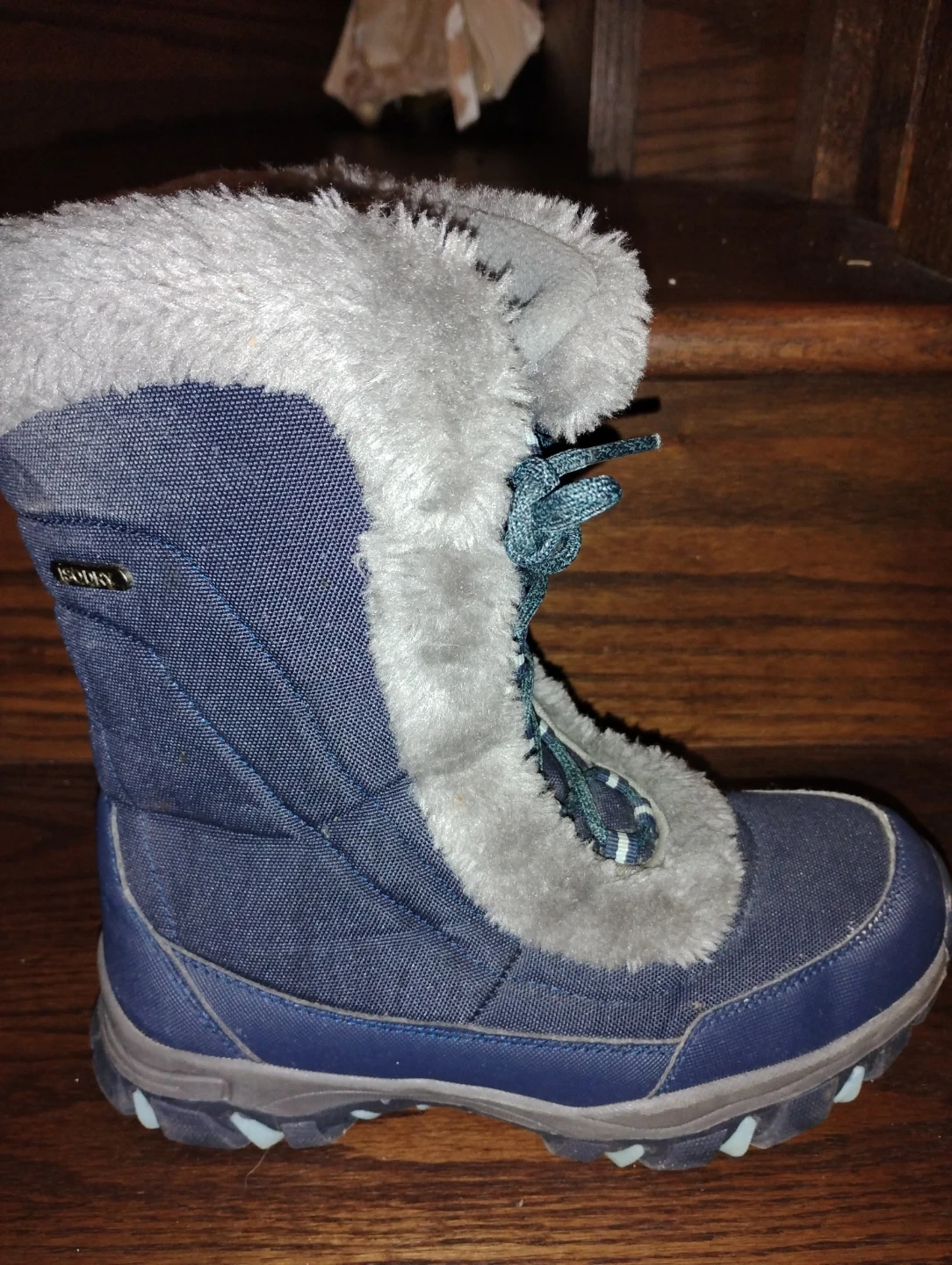 These Canadian mountain winter boots are a deep navy blue with grey faux fur lining. They feature lace-up closure for a snug fit. Great for keeping your feet warm and dry during snowy weather!