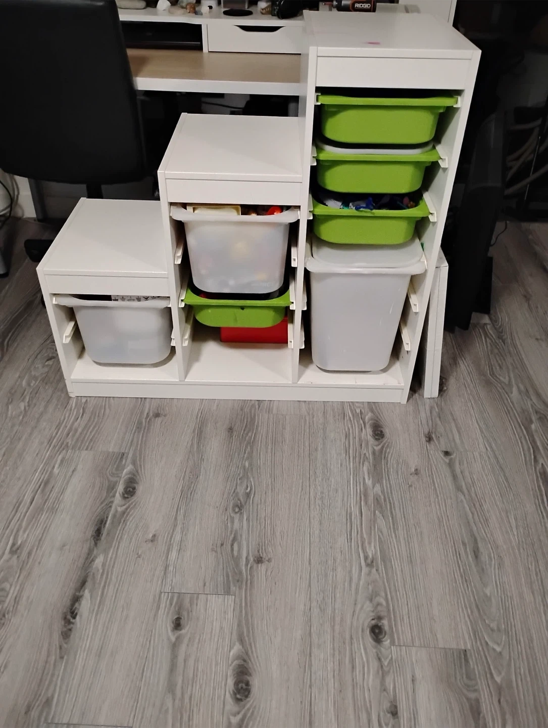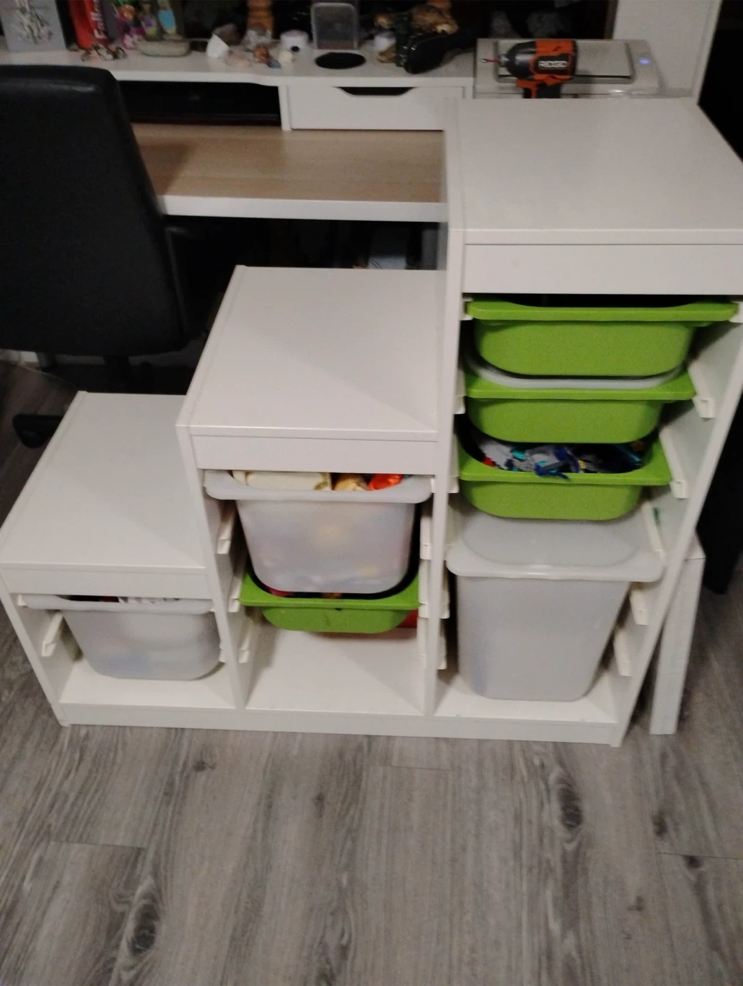 White IKEA TROFAST storage unit. Comes with multiple bins for organizing. This unit is great for toys or general storage! Surface has a couple of faint water marks.