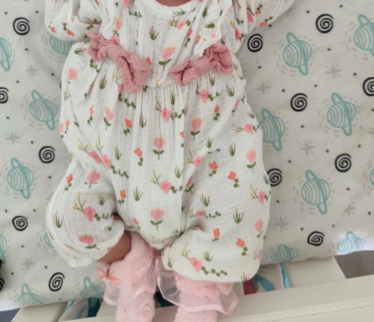 Here's a super cute baby romper with a floral pattern and little pink bows. It's in great condition and perfect for your little one!