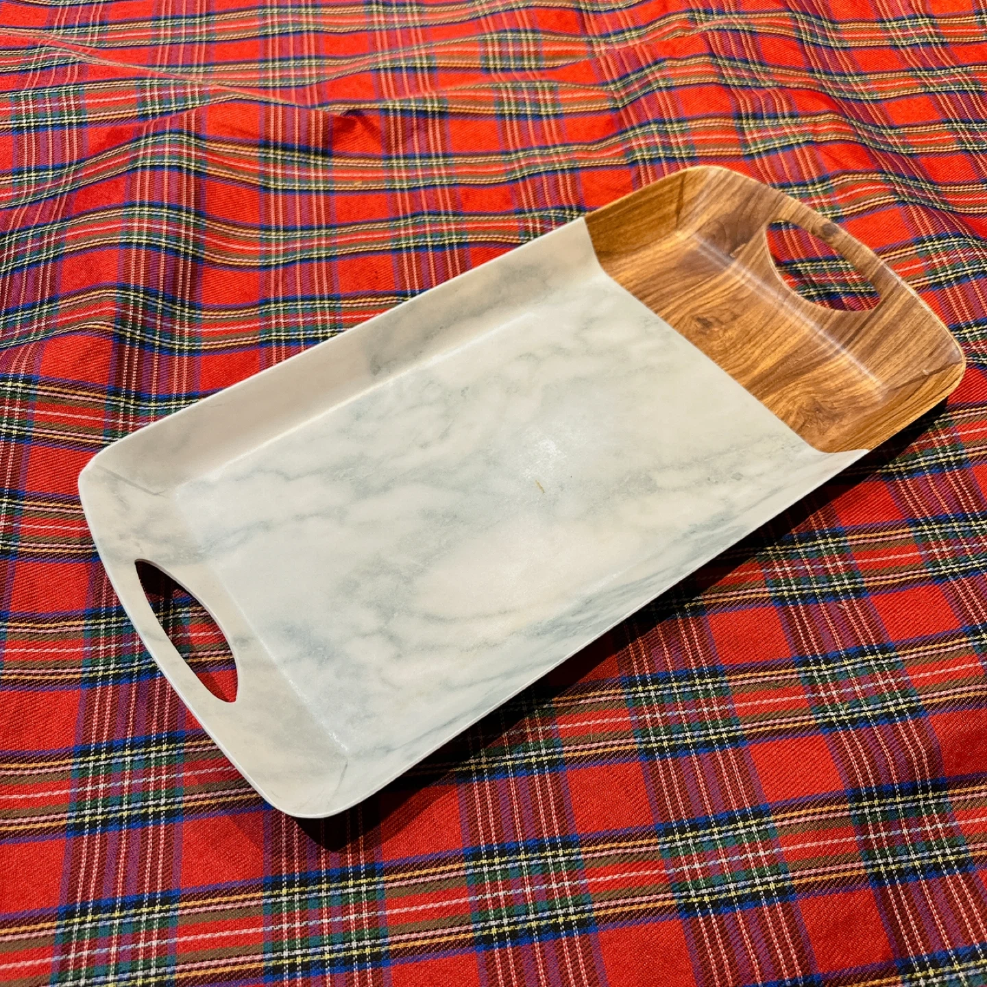 This serving tray features a stylish marble and wood-grain finish. It's perfect for carrying drinks or snacks. The handles make it easy to transport. It's great for parties or everyday use!