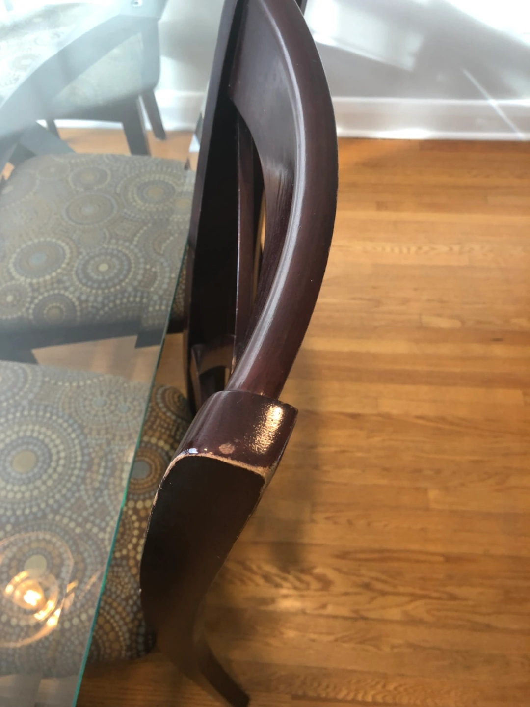 Chairs are in good condition, except for one chair has a leg that was repaired. Take chairs as is.