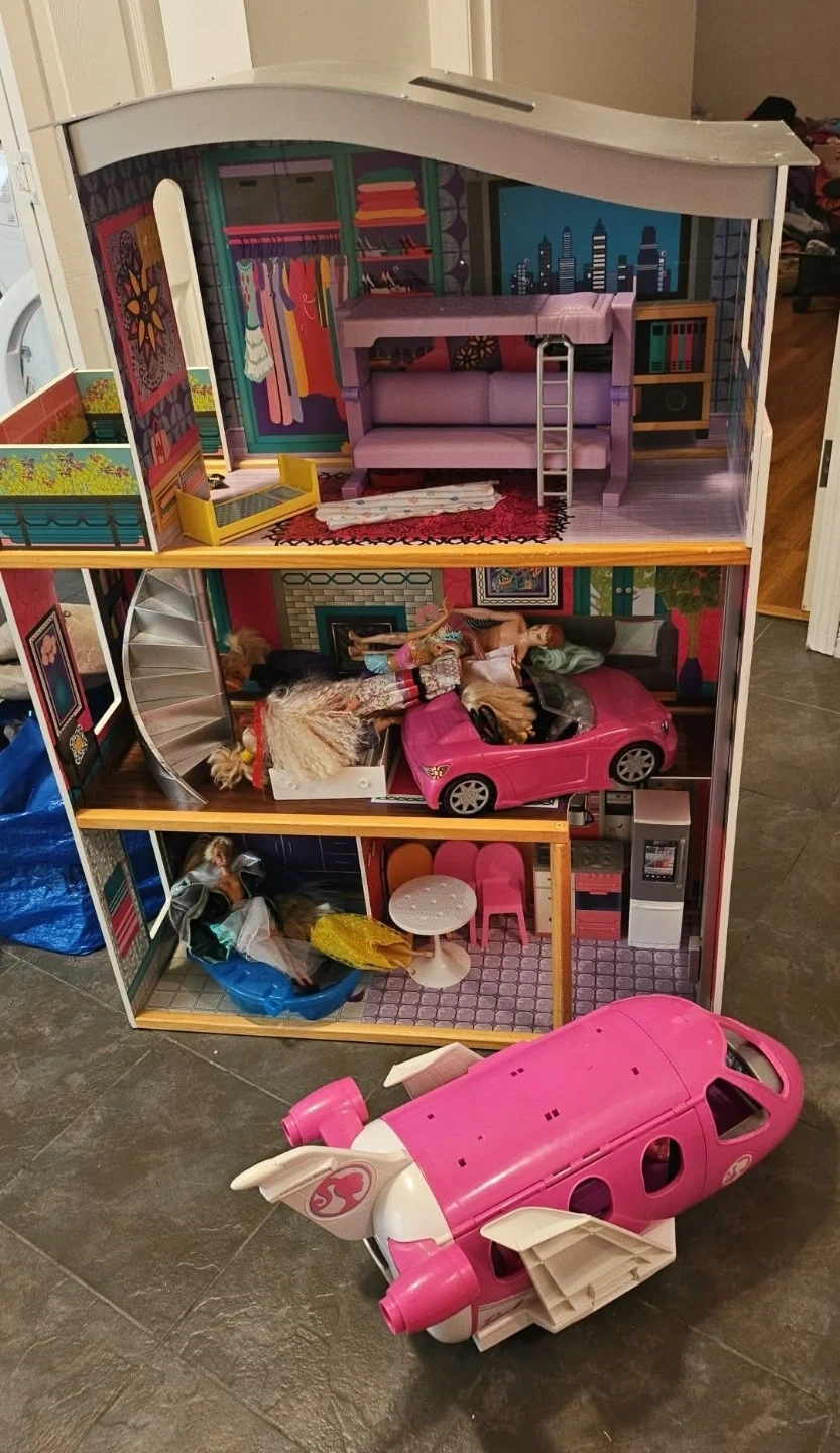 Selling a dollhouse along with some Barbies and accessories - includes a car and an airplane! Great starter set. There may be a Barbie or two that won't be occlusion as it belongs to my daughter's friend.