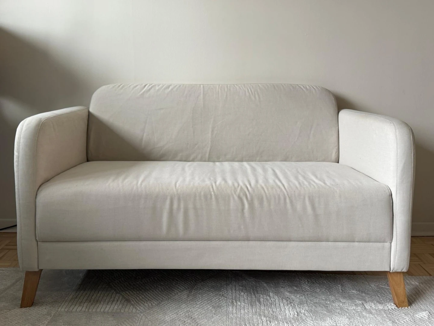 Cream fabric loveseat sofa with wooden legs. It has a modern design and comfortable seating. Perfect for smaller living spaces or as an accent piece.