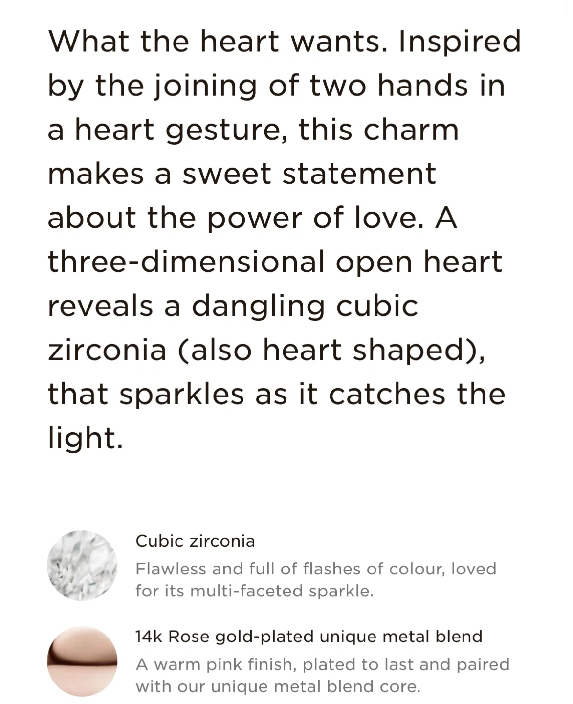 This Pandora Rose charm features an open heart design with a dangling heart-shaped cubic zirconia that sparkles beautifully. It's inspired by the joining of two hands in a heart gesture. The charm is made from a 14k rose gold-plated unique metal blend.