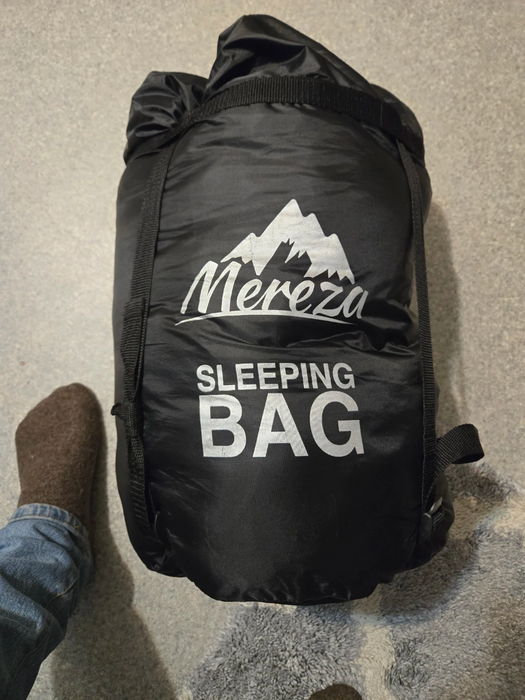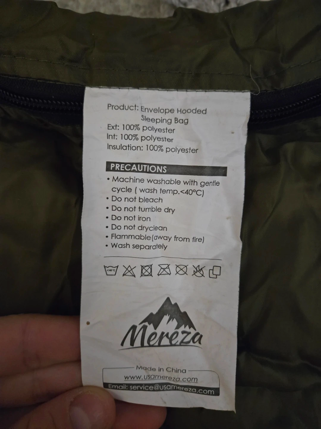 This is a Mereza envelope hooded double sized sleeping bag. The exterior and interior are both 100% polyester, with 100% polyester insulation. Comes with a zipper on both sides. It's machine washable with a gentle cycle at 40°C or less.