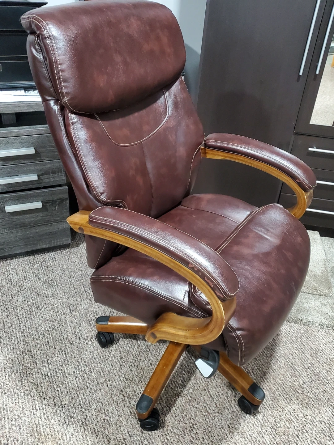 This La-Z-Boy executive office chair comes in a rich brown faux leather. It features a padded seat and back for comfort. The chair has wooden armrests and a five-wheel base for easy mobility.