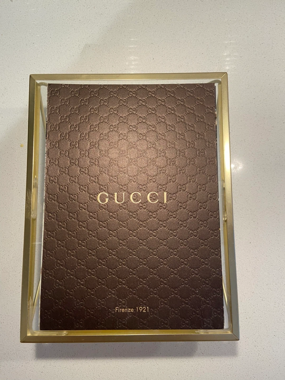 Gucci embossed card. Features the raised iconic GG monogram. Firenze 1921 detail. Paper material. 8 inch by6 inch. Looks great in a frame. Frame in picture is not included.