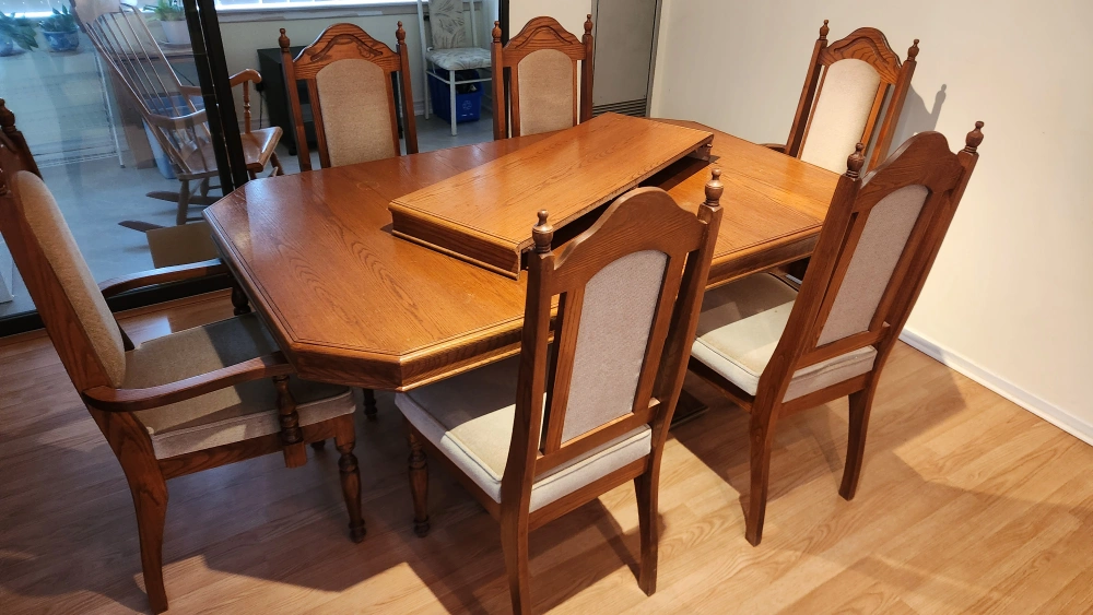 Selling a beautiful oak dining table with six matching chairs. The table has a unique design with a central extension piece. The chairs are upholstered with a neutral fabric.