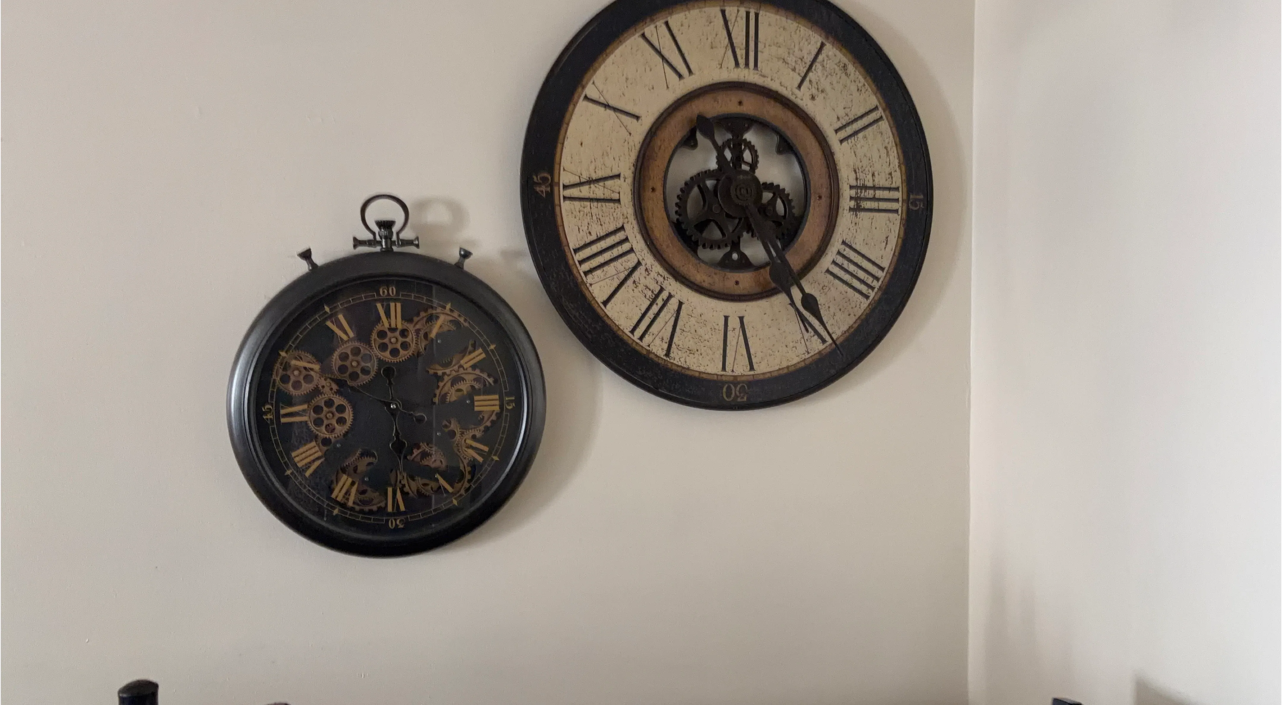 Two decorative wall clocks featuring Roman numerals and exposed gears. One clock has a black frame with a black face, and the other has a dark frame with an aged cream face. They're a stylish addition to any room!