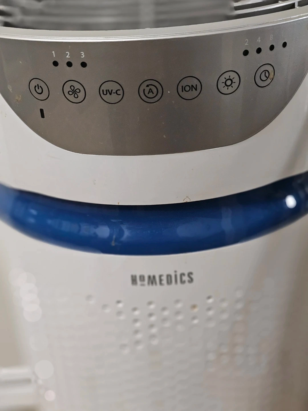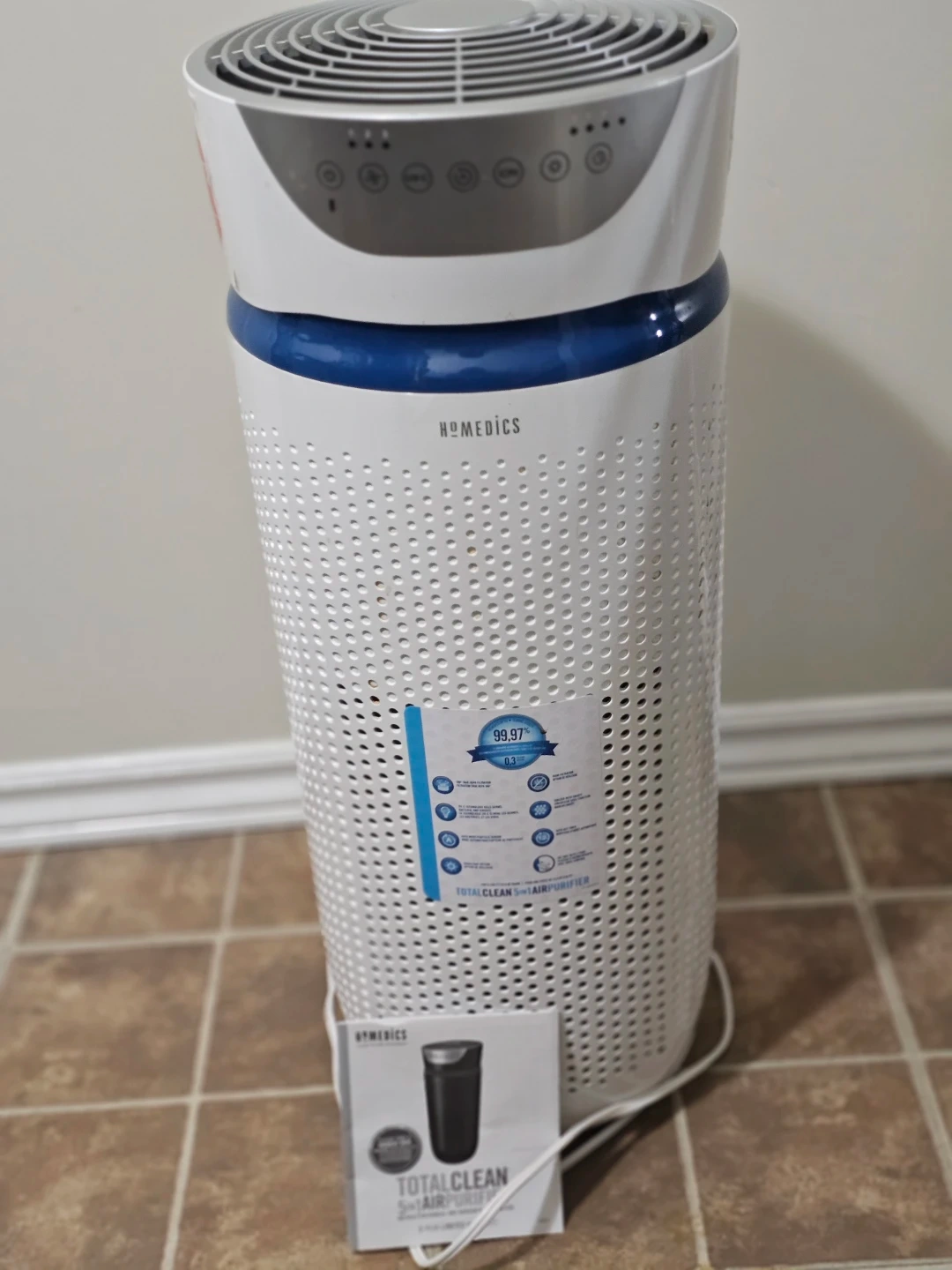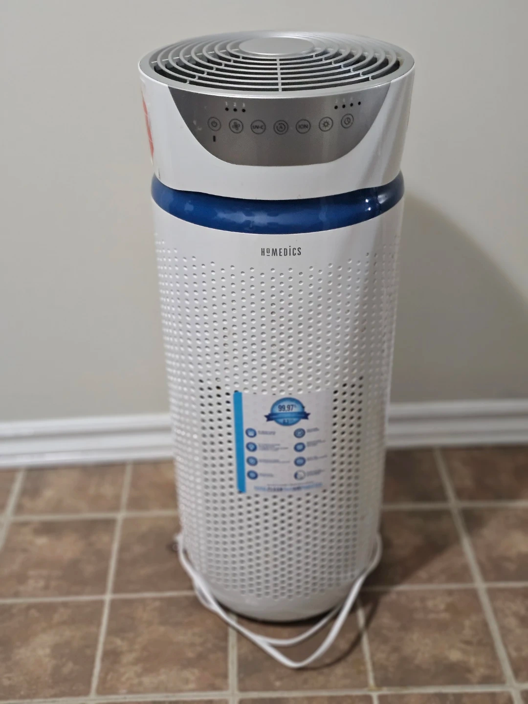 This HoMedics Total Clean air purifier effectively cleans your air. It has settings for fan speed, UV-C, auto mode, and ionizer. It's great for keeping your home's air fresh!
