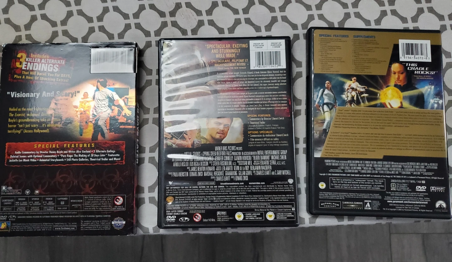 This lot includes three DVDs: '28 Days Later' (Widescreen Special Edition), 'Blood Diamond' (Widescreen Edition), and 'Lara Croft: Tomb Raider' (Special Collector's Edition). All discs are in good condition and come with their original cases. $20 for all three or buy individually.