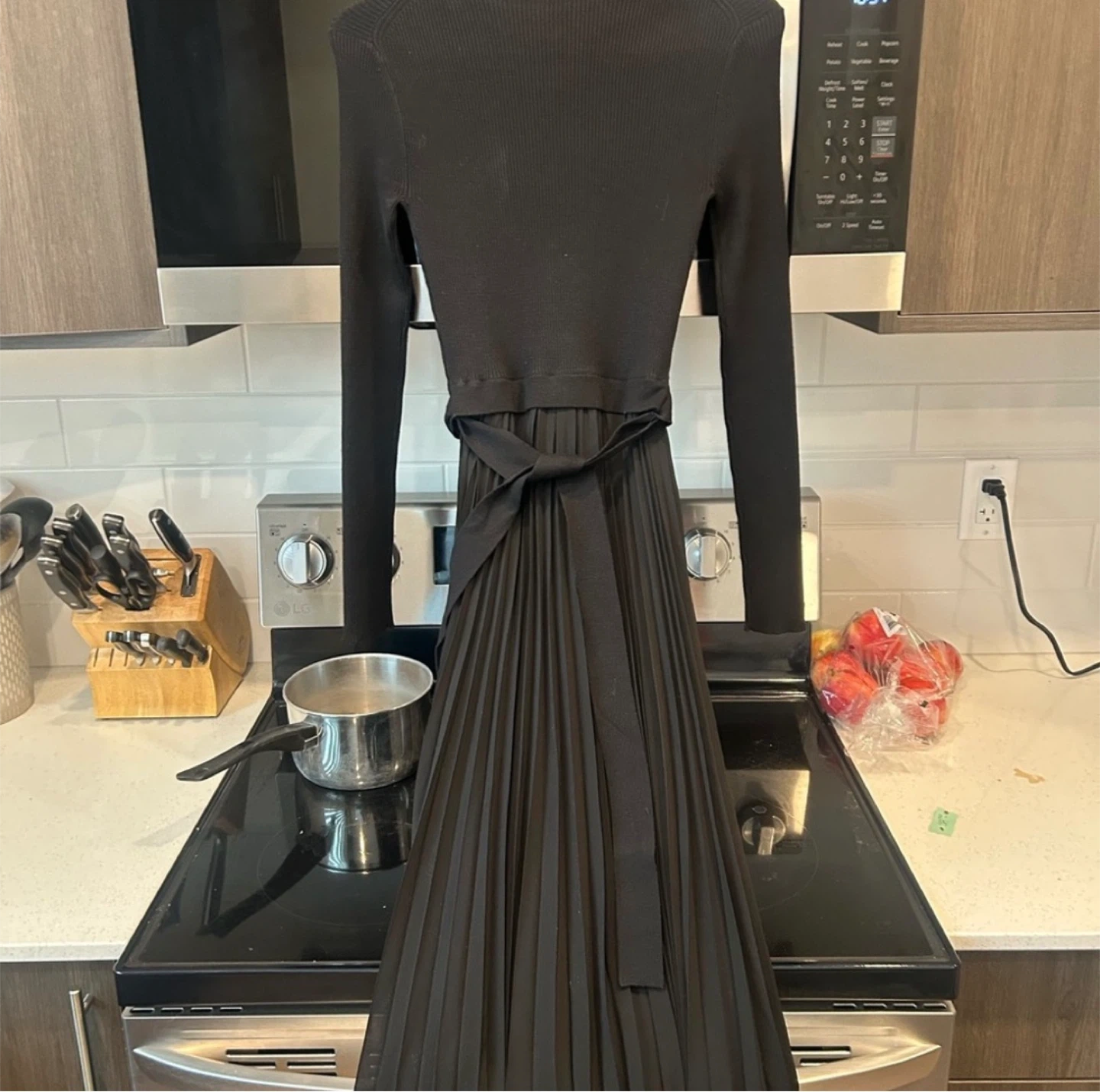 This Ever New Melbourne dress features a black knit top with a long sleeve and a pleated midi skirt. It comes with a removable tie belt. Made from recycled polyester.