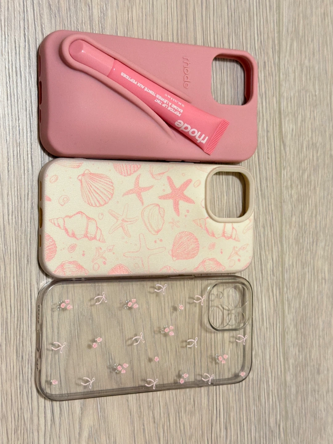 This bundle includes a pink Rhode Peptide Lip Tint, a pink phone case with a built-in lip tint holder, and another decorative phone case. The lip tint is 10ml and has a peptide formula.