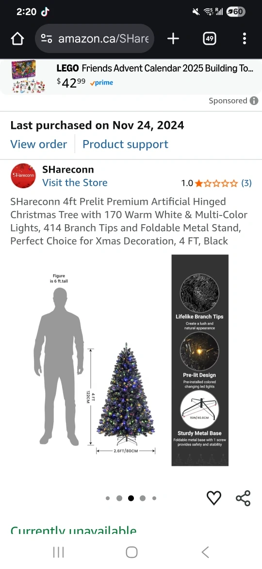 Selling a SHareconn 4ft Prelit Premium Artificial Hinged Christmas Tree with 170 Warm White & Multi-Color Lights. It has 414 Branch Tips and a Foldable Metal Stand. Perfect for Xmas Decoration, 4 FT, Black