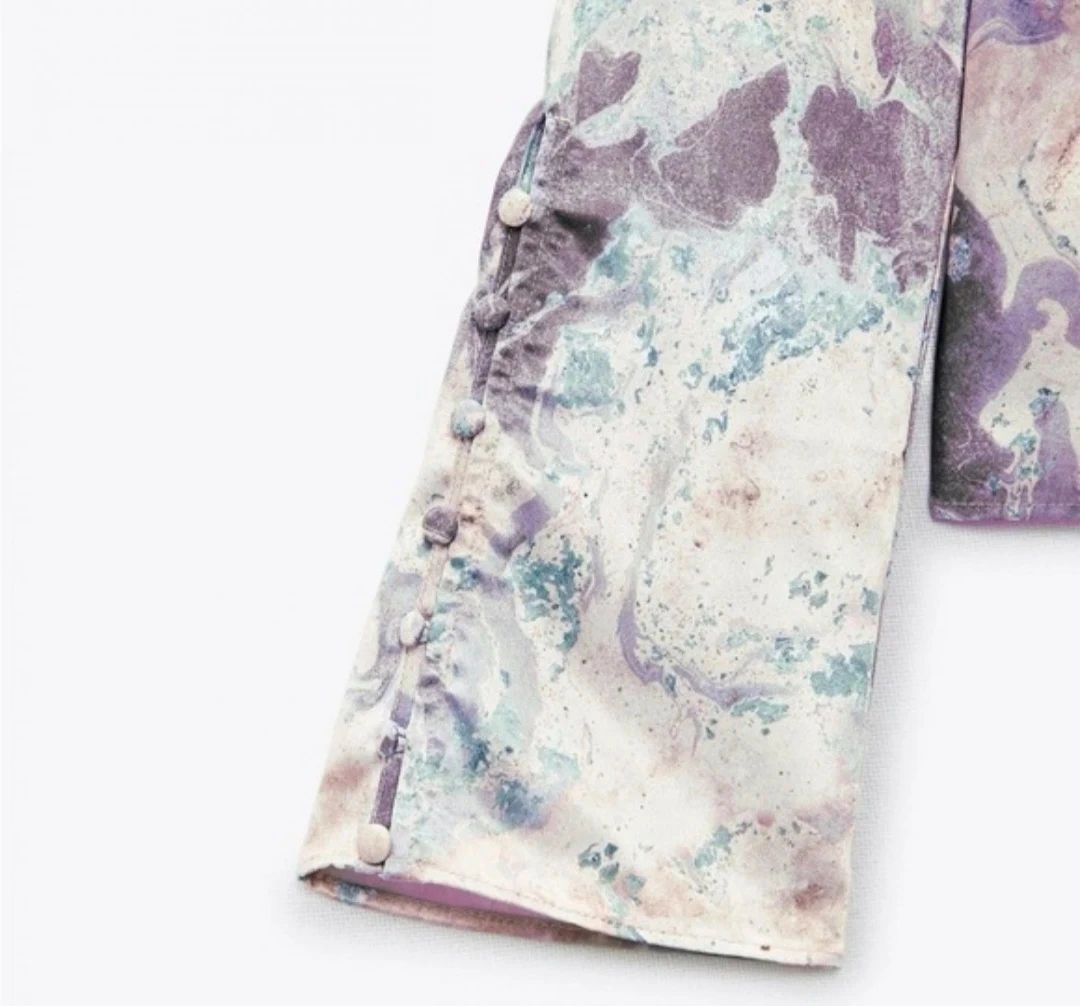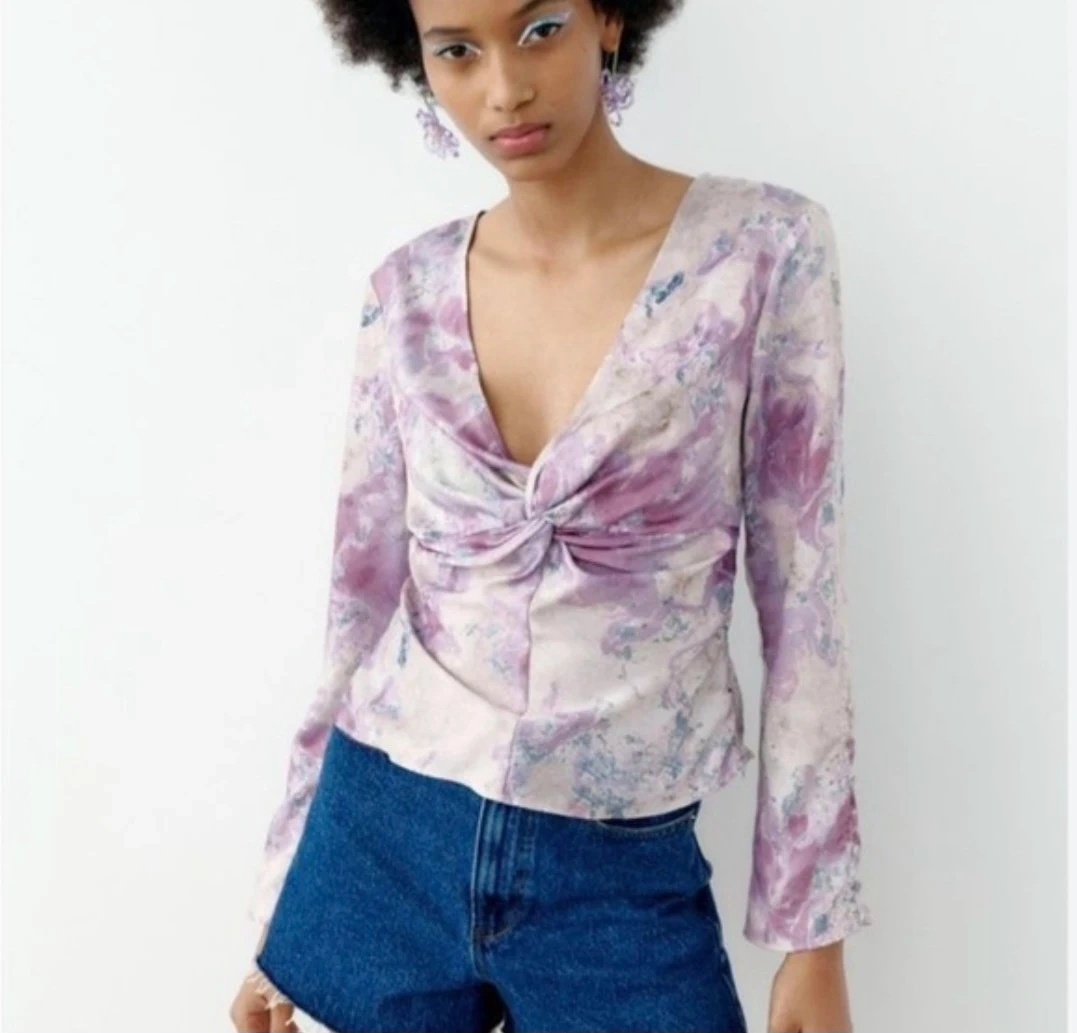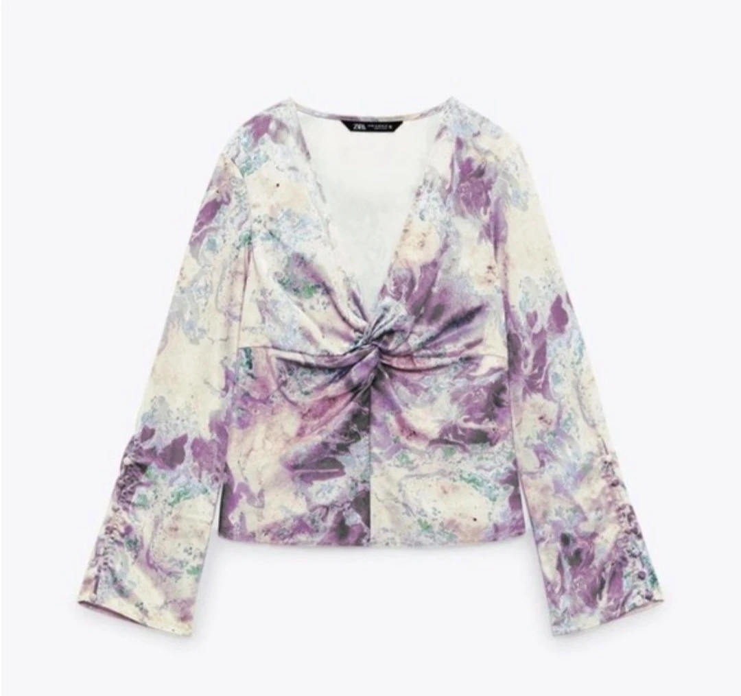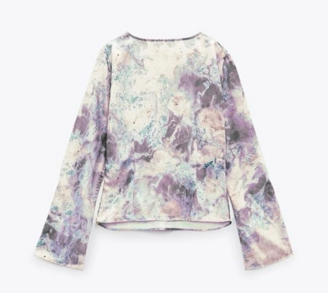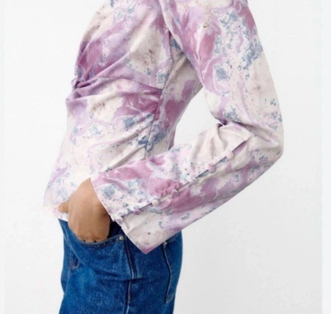Add a touch of effortless elegance to your wardrobe with this stunning Zara blouse. Featuring a dreamy purple and lavender marbled watercolor print, this top is perfect for transitioning from a day at the office to a night out.
