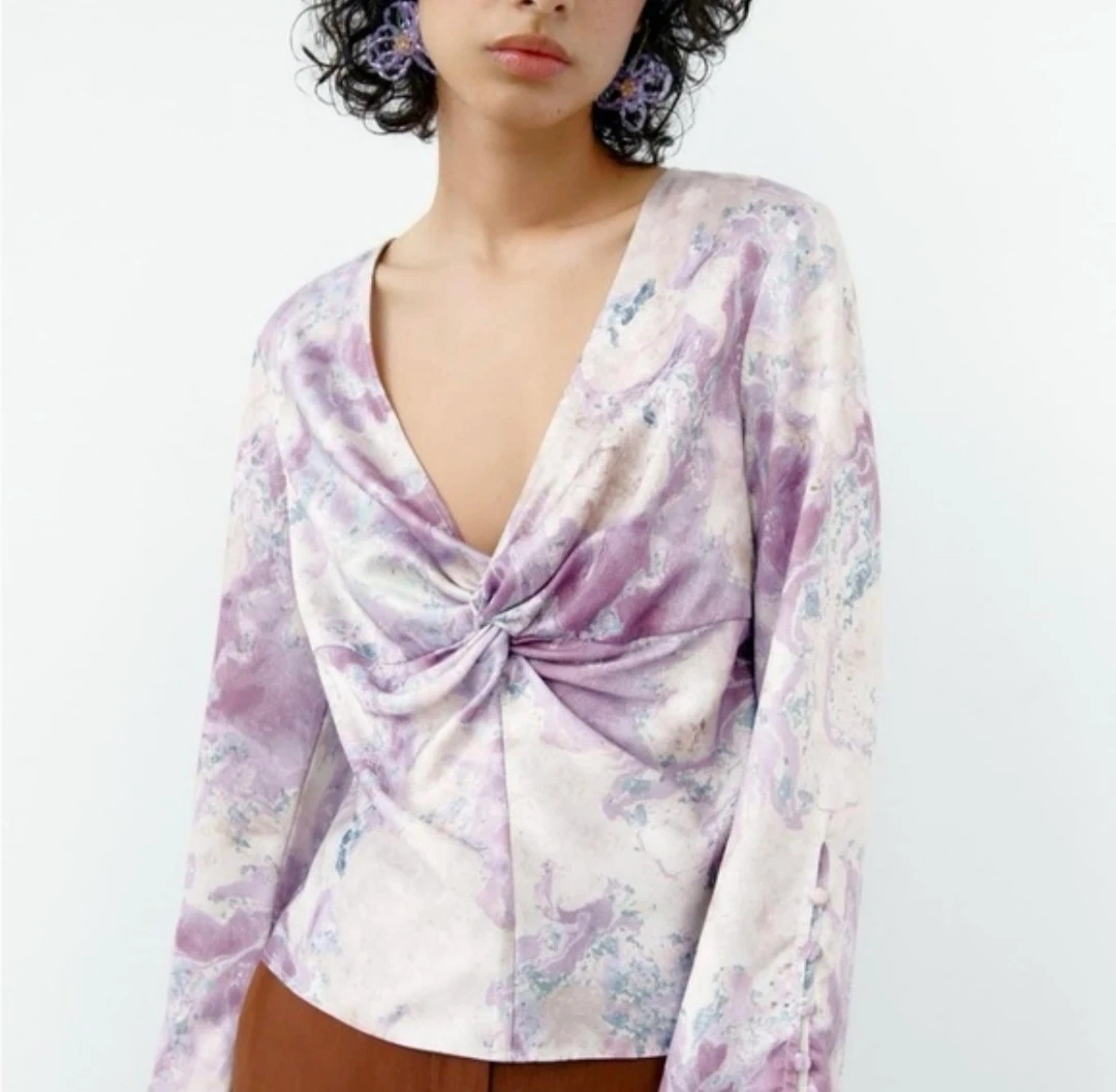 ZARA Purple Marble Print Knot Front V-Neck Blouse - Size Small - Satin Effect