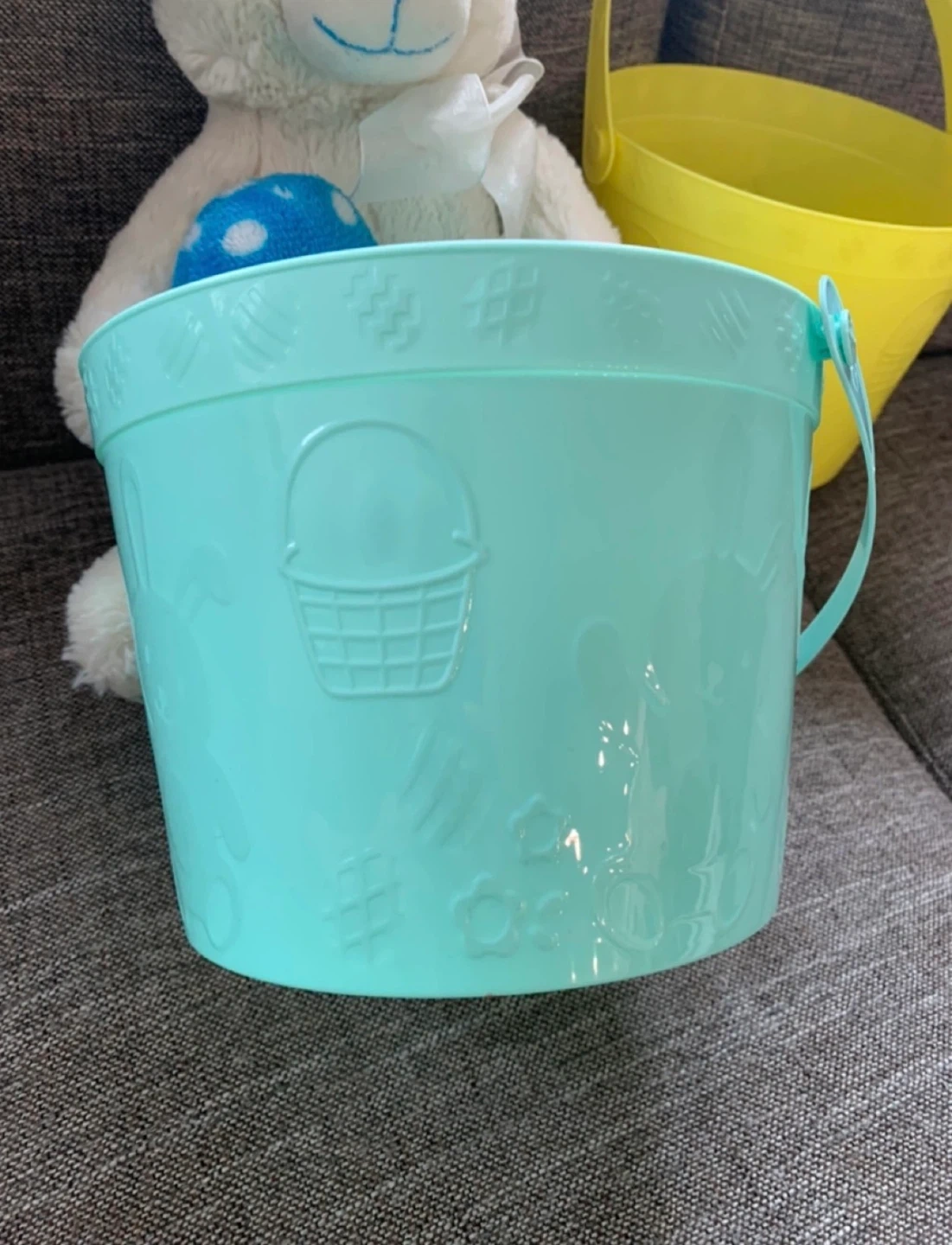Two pastel-coloured plastic Easter baskets.