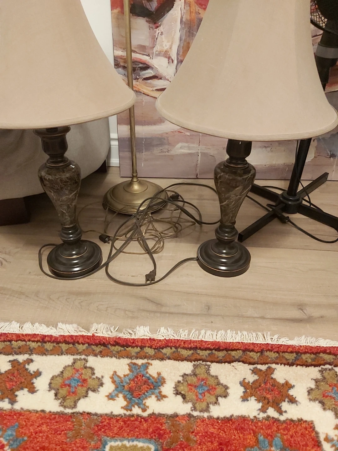 This set includes two matching table lamps with beige fabric shades. The lamp bases have a decorative, marble-like pattern and a dark bronze finish. They're perfect for adding ambient lighting to a living room or bedroom.