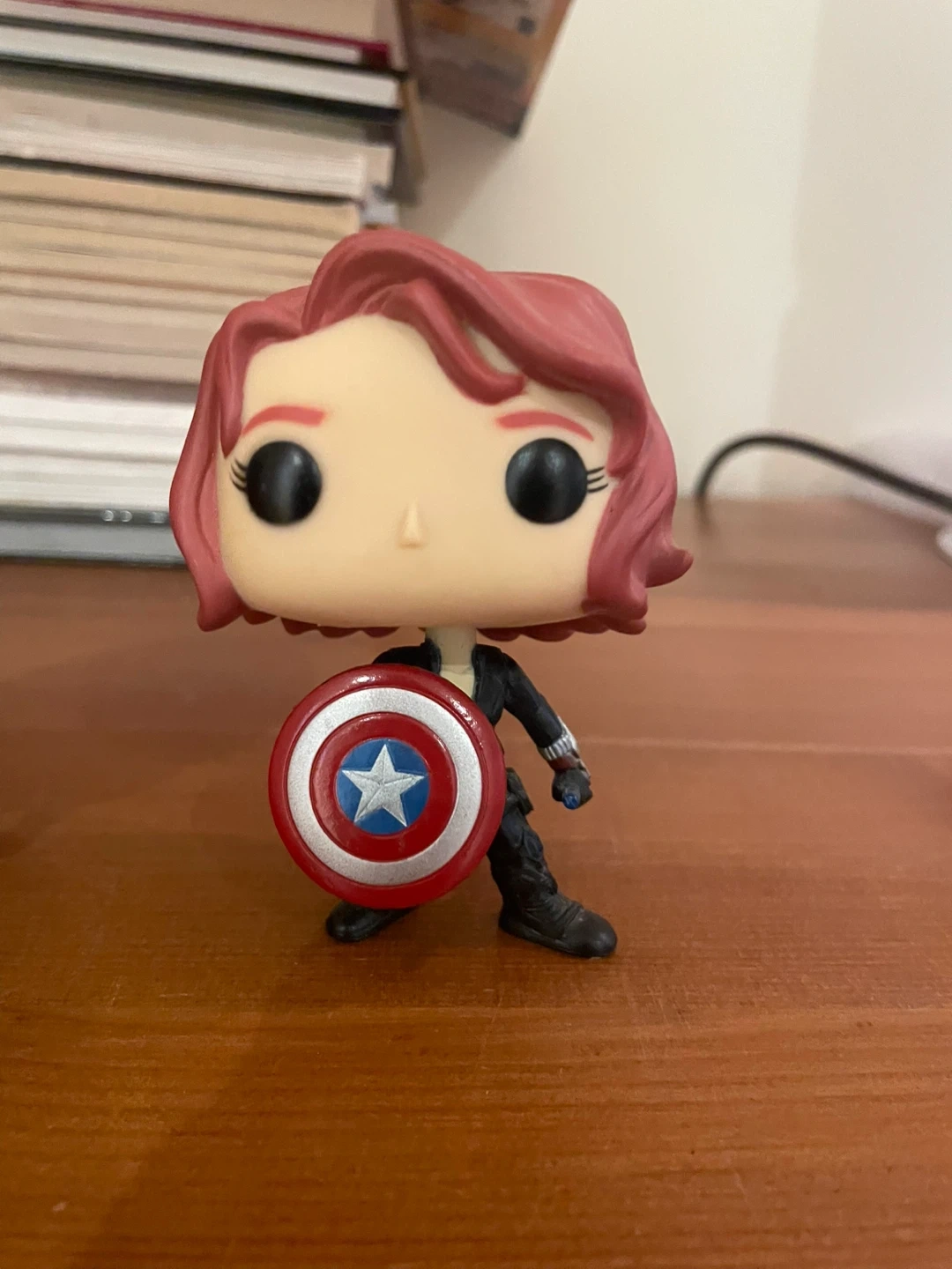 This is a Funko Pop! vinyl figure of Black Widow. It comes with Captain America's iconic shield. It's a great collectible for Marvel fans!