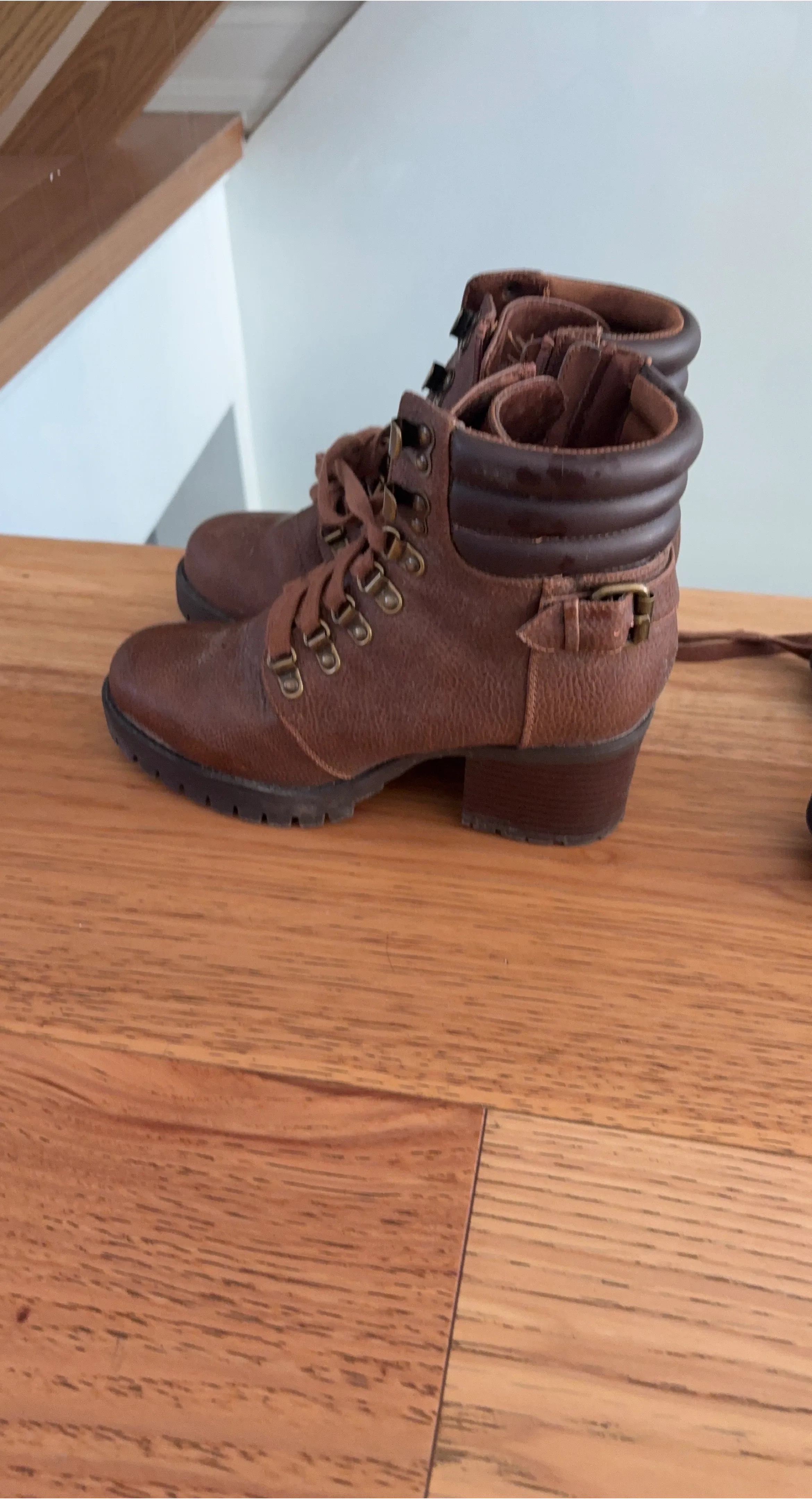 These stylish brown ankle boots are made from genuine leather. They feature a lace-up front and a side buckle detail. The heel height is approximately 2 inches.