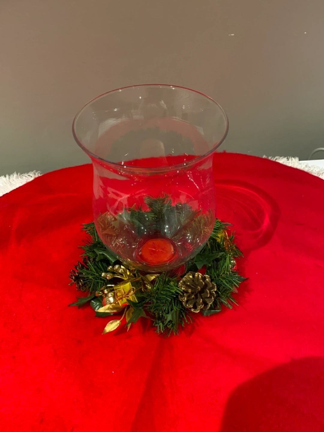 Selling a lovely glass candle holder, complete with a festive wreath. Adds a warm touch to any holiday setting. Candle included