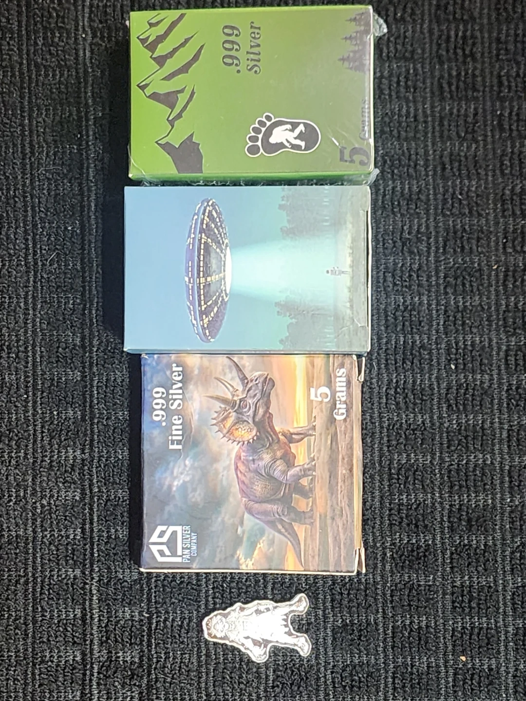 I'm selling .999 fine silver from Pan Silver Company. Each box contains 5 grams of silver. Available designs include: Bigfoot, UFO, and Triceratops.