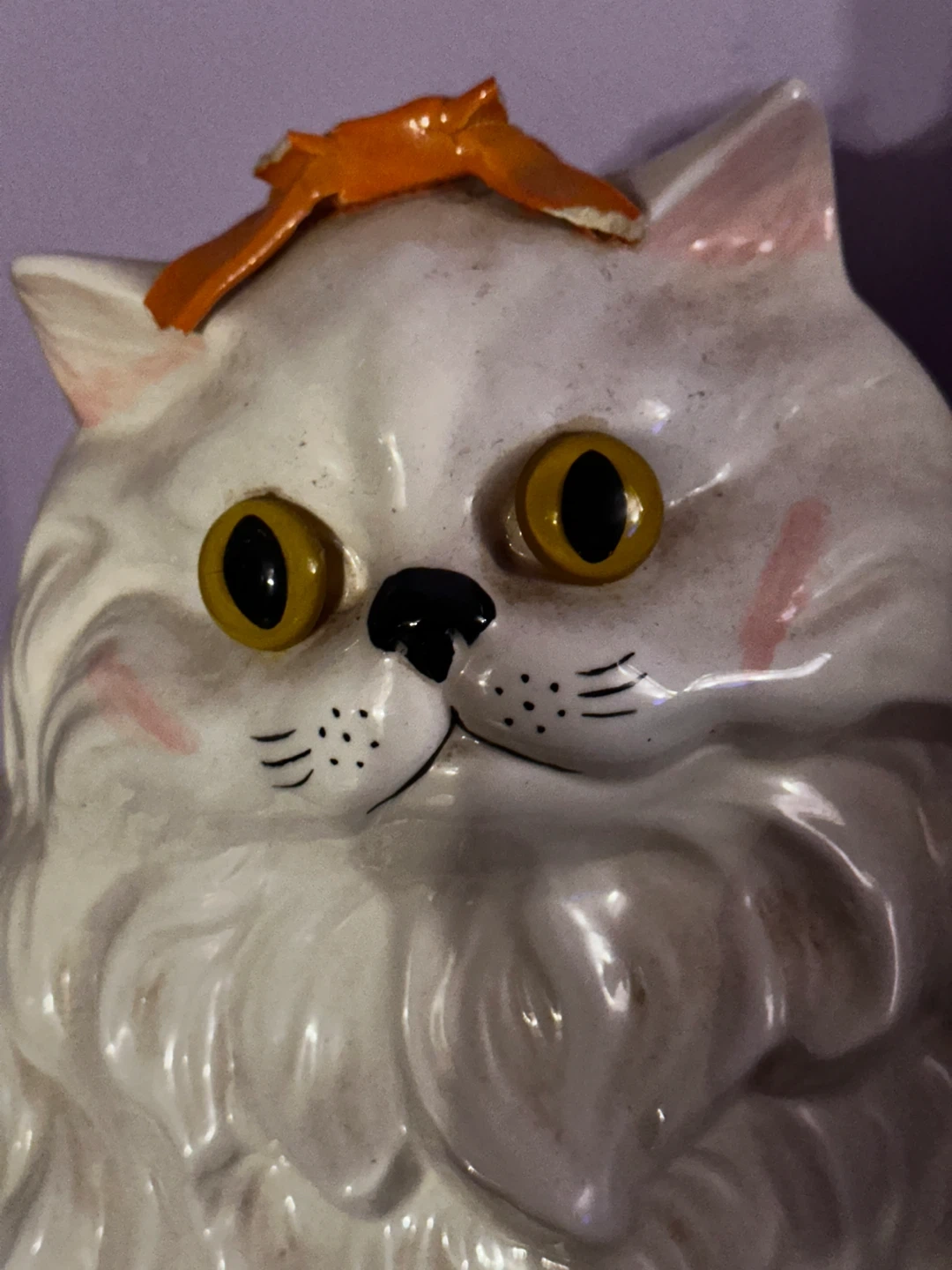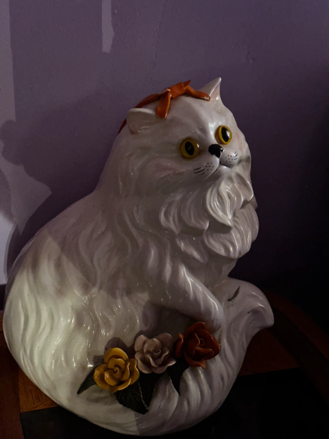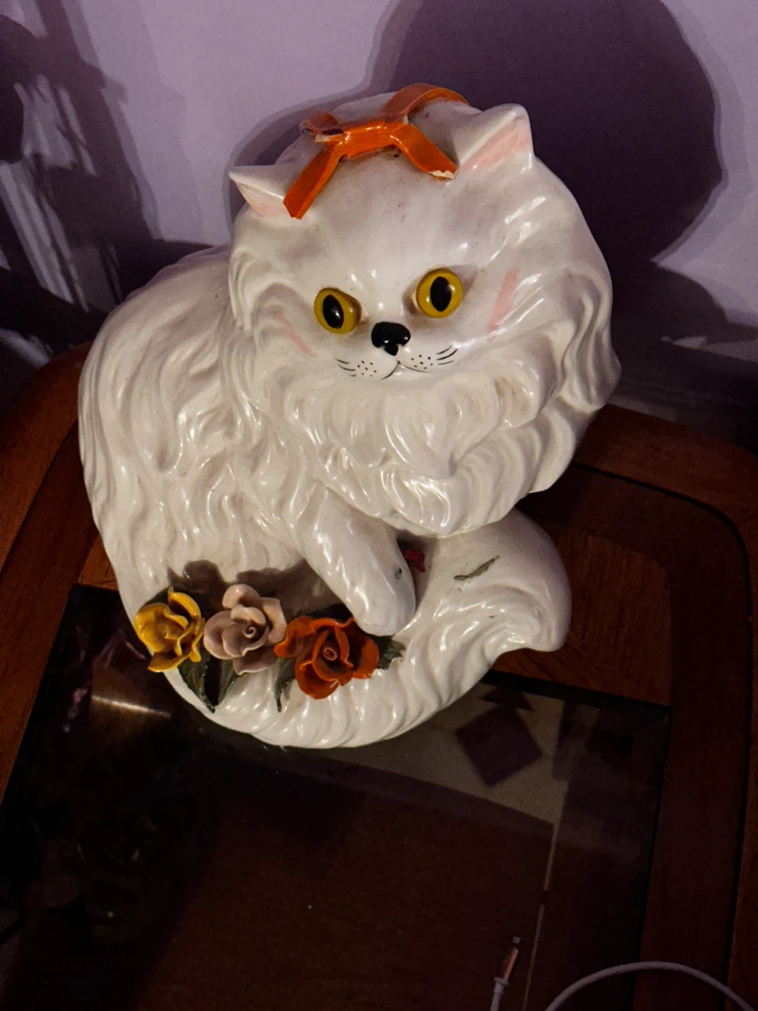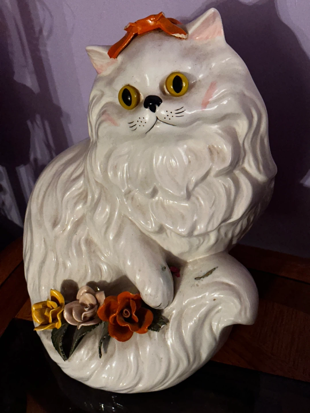This is a vintage ceramic cat figurine. It's white with yellow eyes and an orange bow. It has decorative flowers at its base. It's a cute piece for home decor!