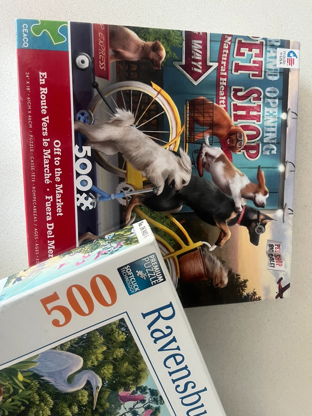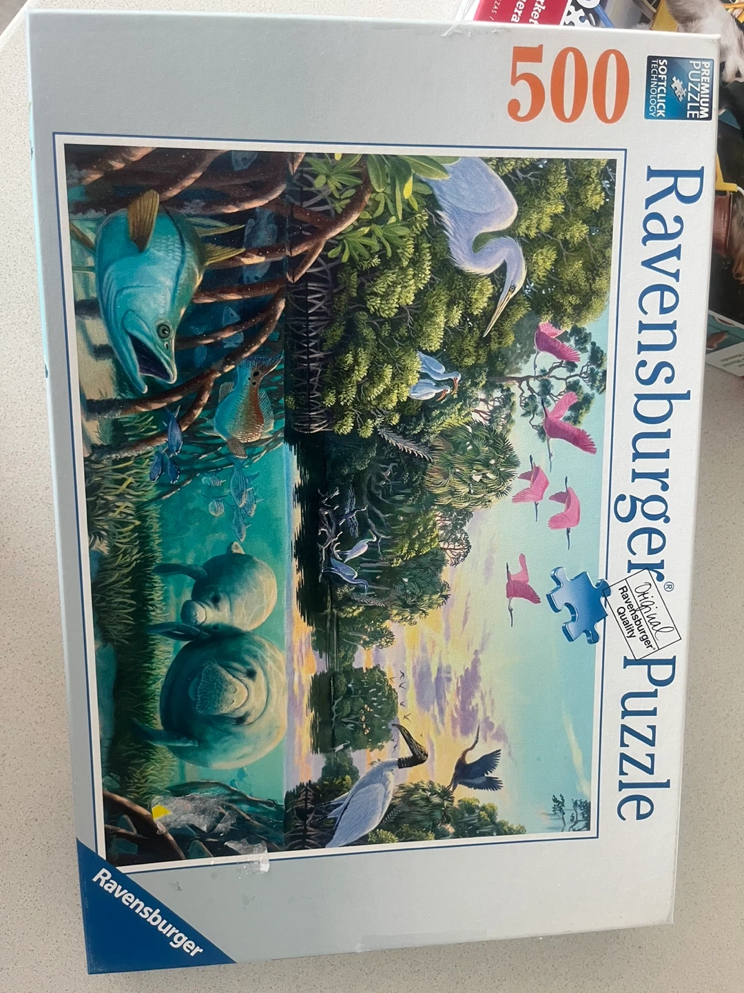 Two 500-piece Ravensburger puzzles. It depicts a serene wildlife scene with manatees and birds, and another one with dogs on bikes.